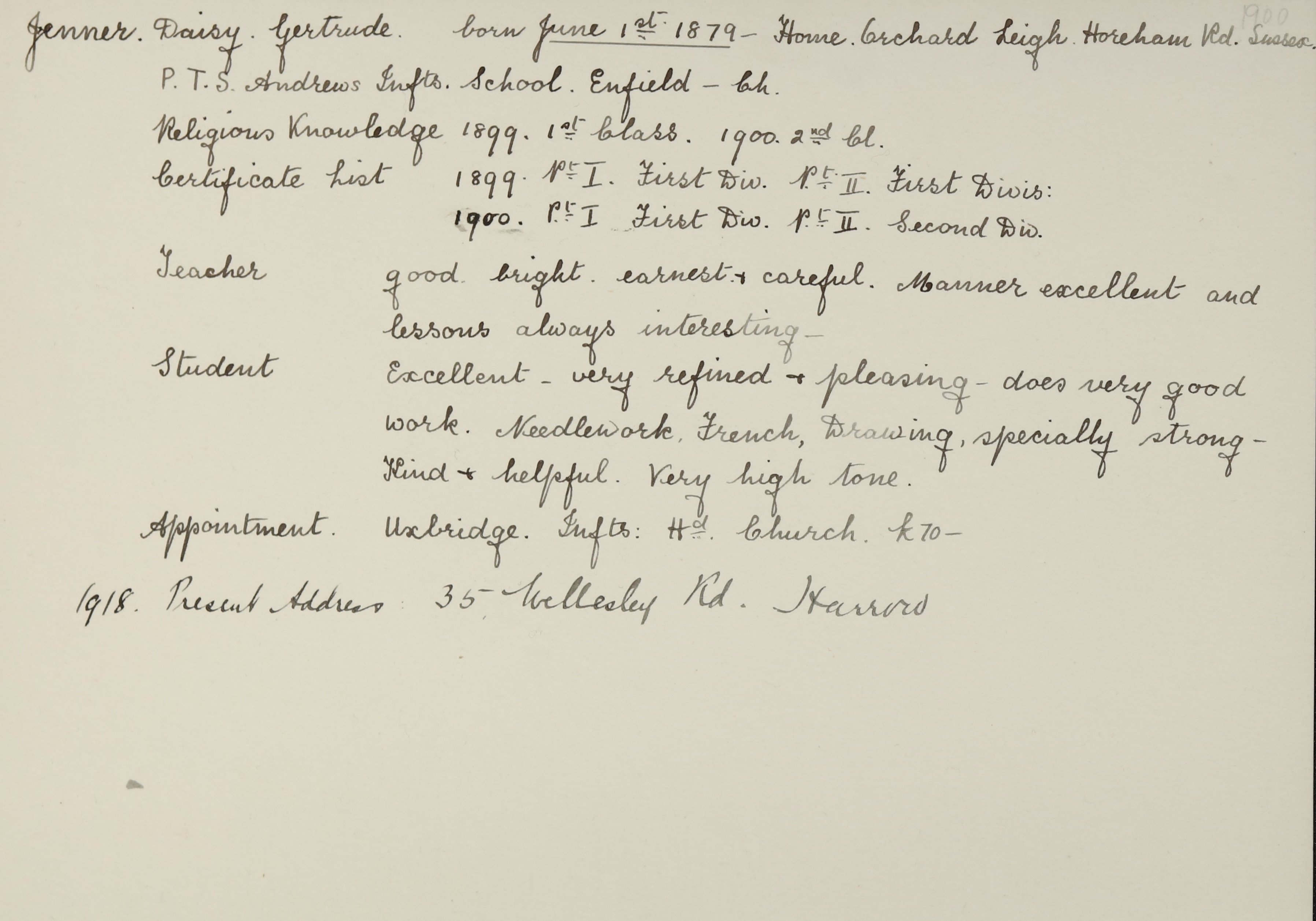JENNER, Daisy Gertrude of 35 Wellesley Road, Harrow, Middlesex, spinster died 24 July 1953 at Harrow Hospital, Roxeth Hill, Harrow. Administration (with Will) London 15 March to Pauline Margaret Stevens (wife of Guy William Willis Stevens). Effects 163, 14s, 8d.