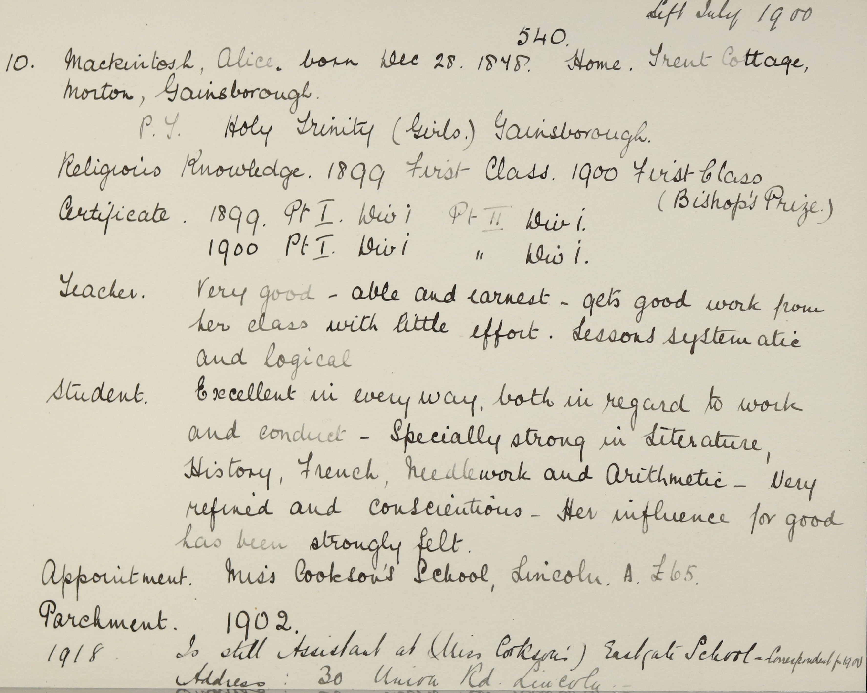 Appointed to Miss Cookson's School, Lincoln (Church), Assistant.