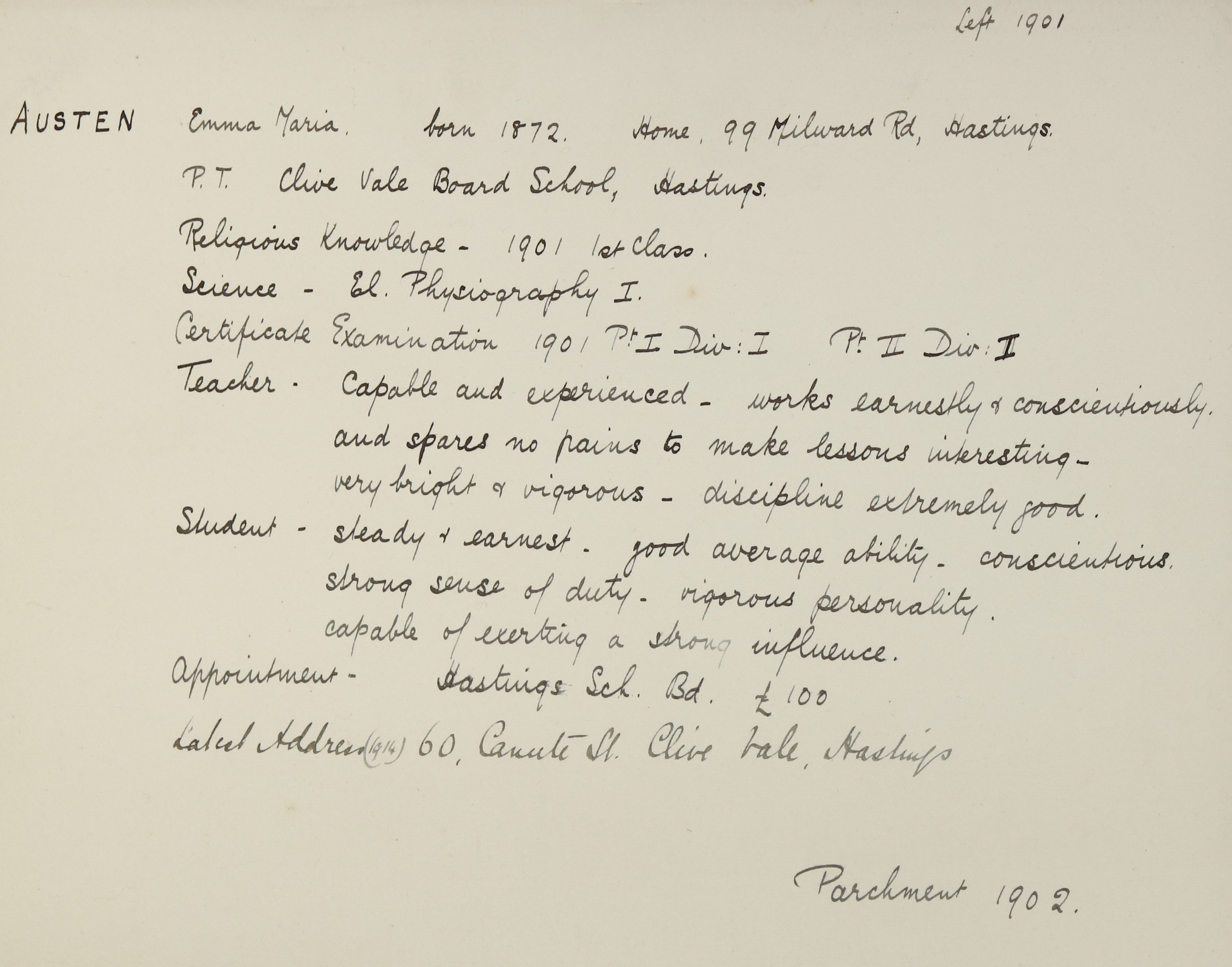 AUSTEN, Emma Maria of 12 Fairlight Avenue, Hastings, spinster, died 11 September 1960. Probate London 16 December to Edith Louise Austen, spinster. Effects £11,502, 2s, 10d.