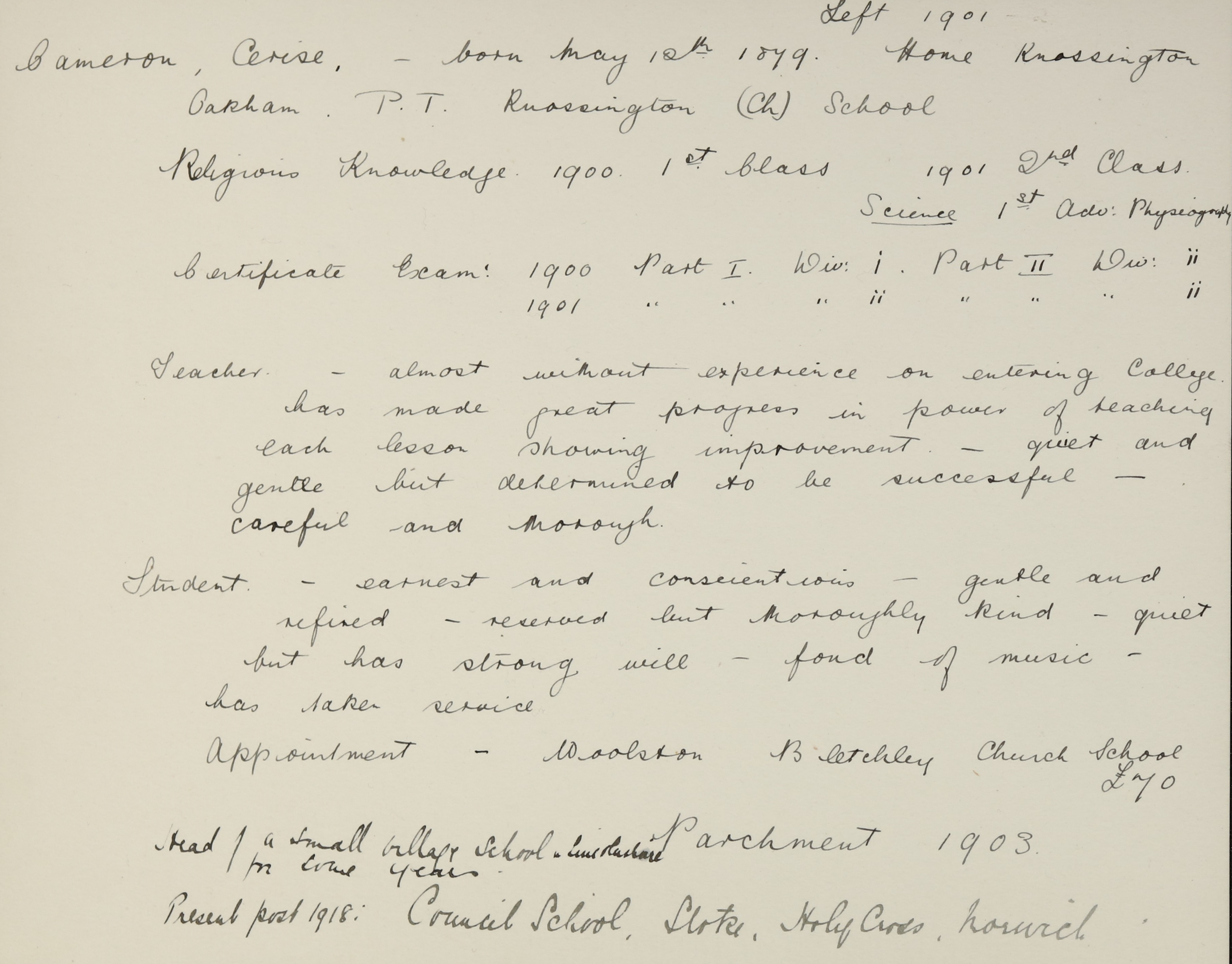 She is at Grange Stables, Knossington. Her father is listed as ‘Stud Groom Domestic’. Her mother and her sisters, Mabel and Ida, are unlisted. Cerise is listed as ‘Student Lincoln College for Schoolmistresses’. George Holmby (b. 1875), a lodger, is listed as ‘Coachman Domestic’. William Edgar (b. 1871), a lodger, is listed as ‘Groom Domestic’.