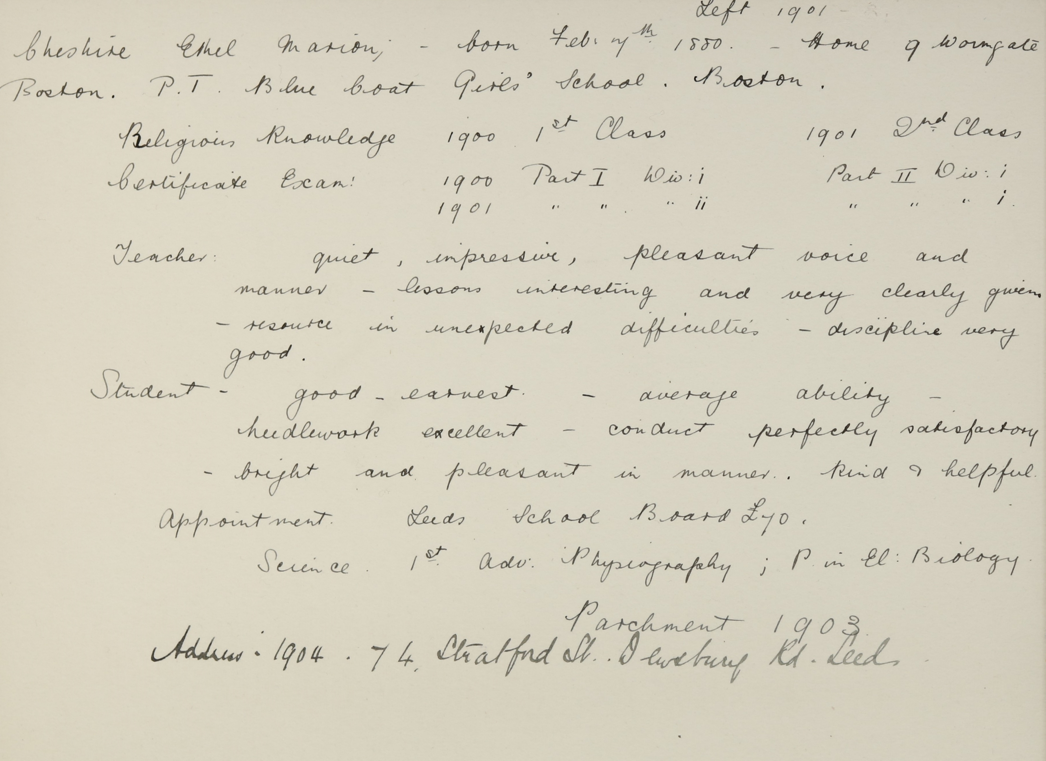 She is at 9 Wormgate, Boston. Her father is listed as ‘Furniture Broker & Dealer’. Her mother and brother, John, are unlisted. Ethel is listed as ‘Teacher (Training)’. Her sister, Ruth, is listed as ‘pupil teacher’.