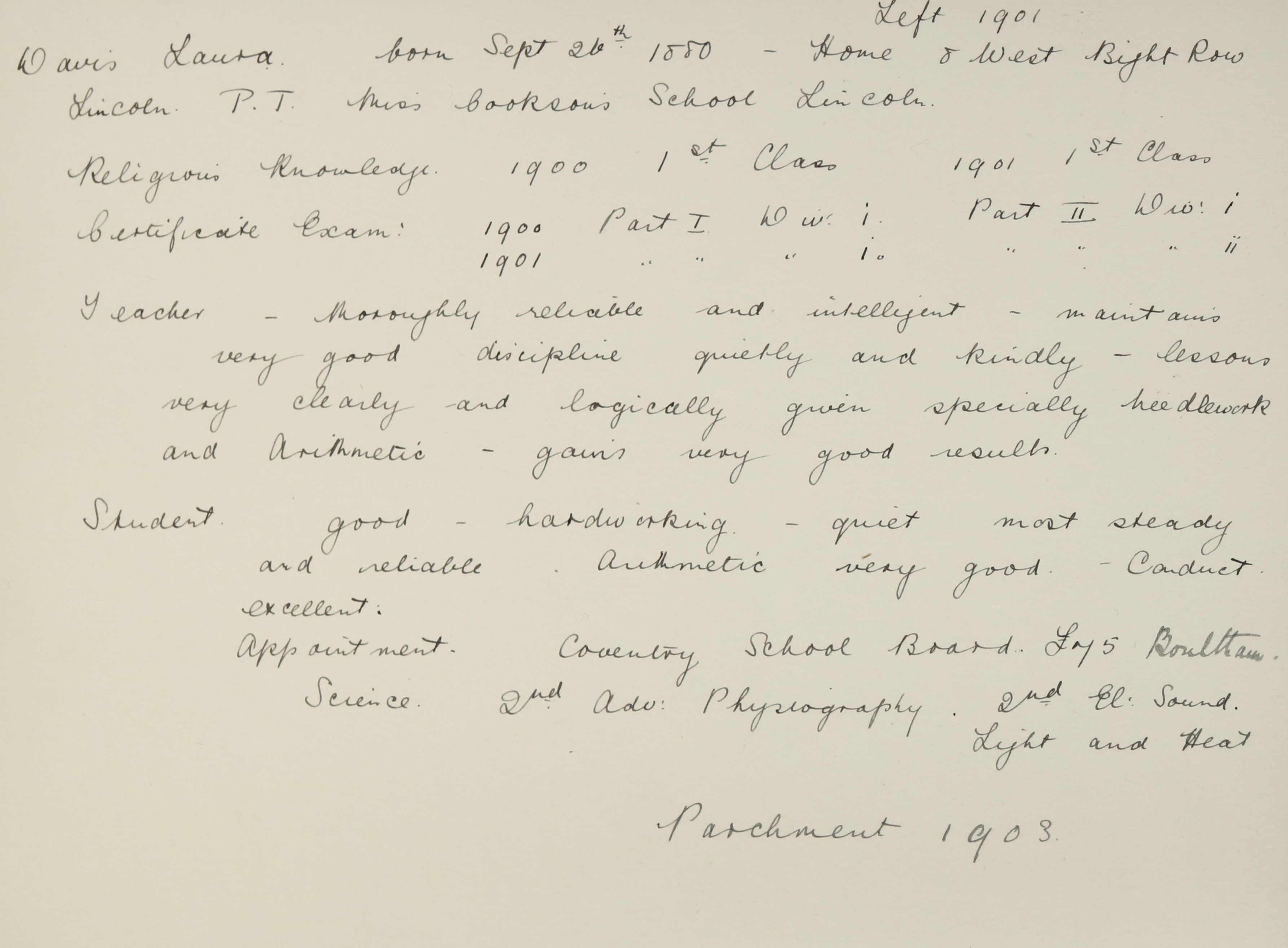 She is at West Bright Row, Lincoln. Her father is listed as ‘Stone Mason’. Her mother and siblings, Rose and Frederick, are unlisted. Laura is listed as ‘School Teacher’. Her brother, William, is listed as ‘Engine Fitters Apprentice’. Her brother, Frank, is listed as ‘Stone Mason Apprentice’.