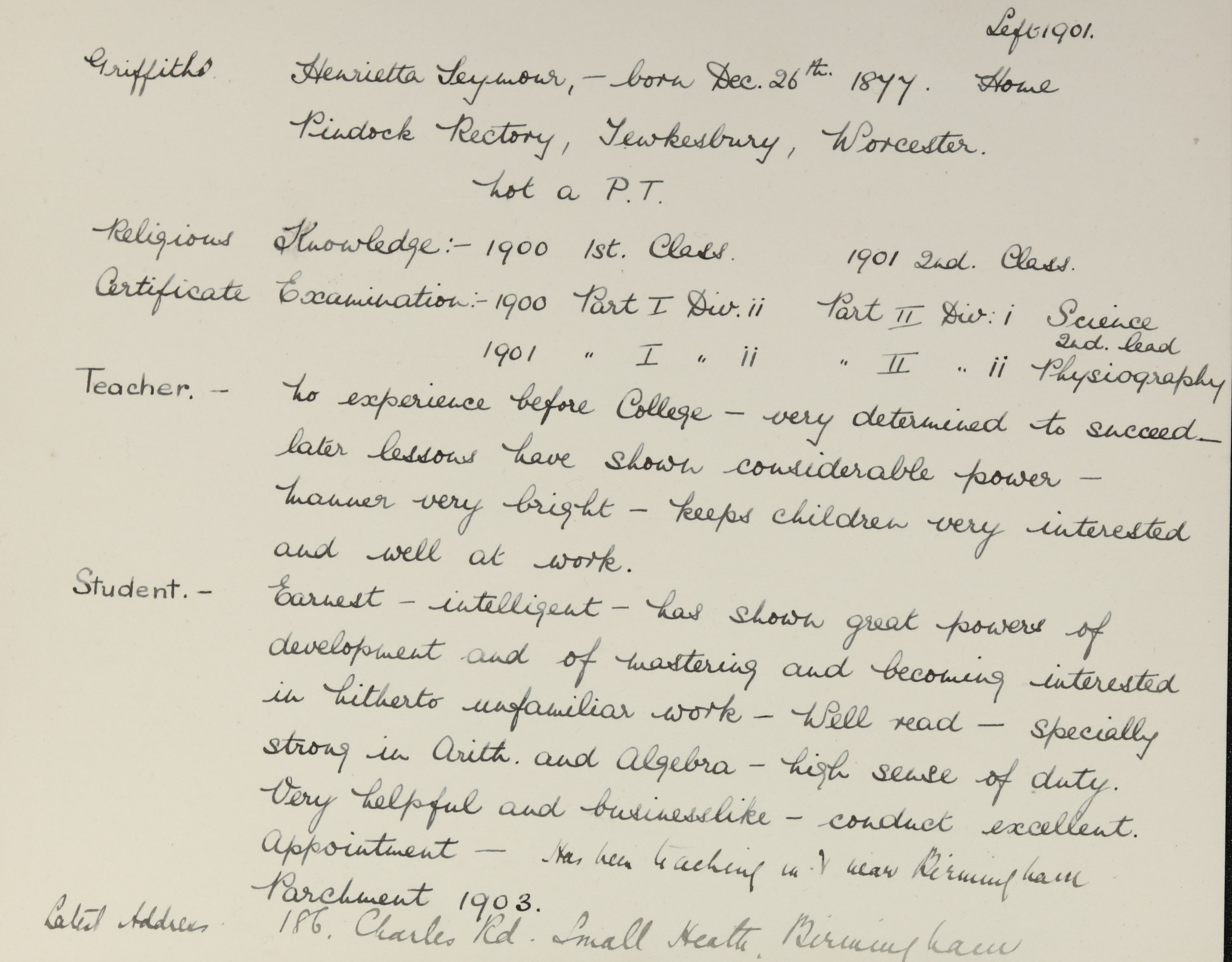 She is at The Rectory, Pendock, Tewkesbury. Her father is listed as ‘Priest of Church of England’. Henrietta, her mother and her sister, Amy, are unlisted. There is a visitor, Minnie Priest (b. 1850). There are two servants, Ellen Freeman (b. 1884) and Alfred Bayliss (b. 1884).
