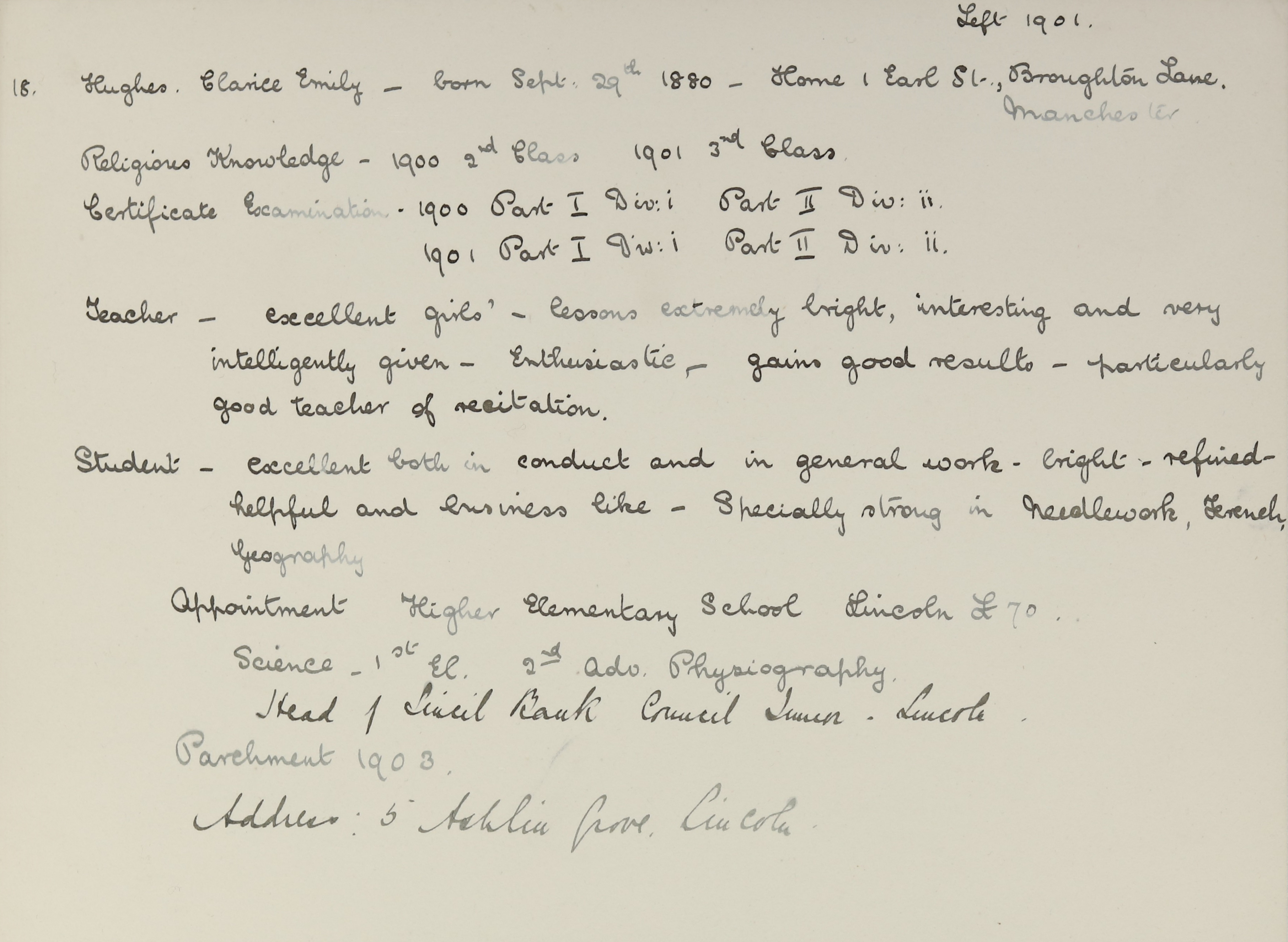 Appointed to Continuation Higher Grade, Lincoln. Assistant.