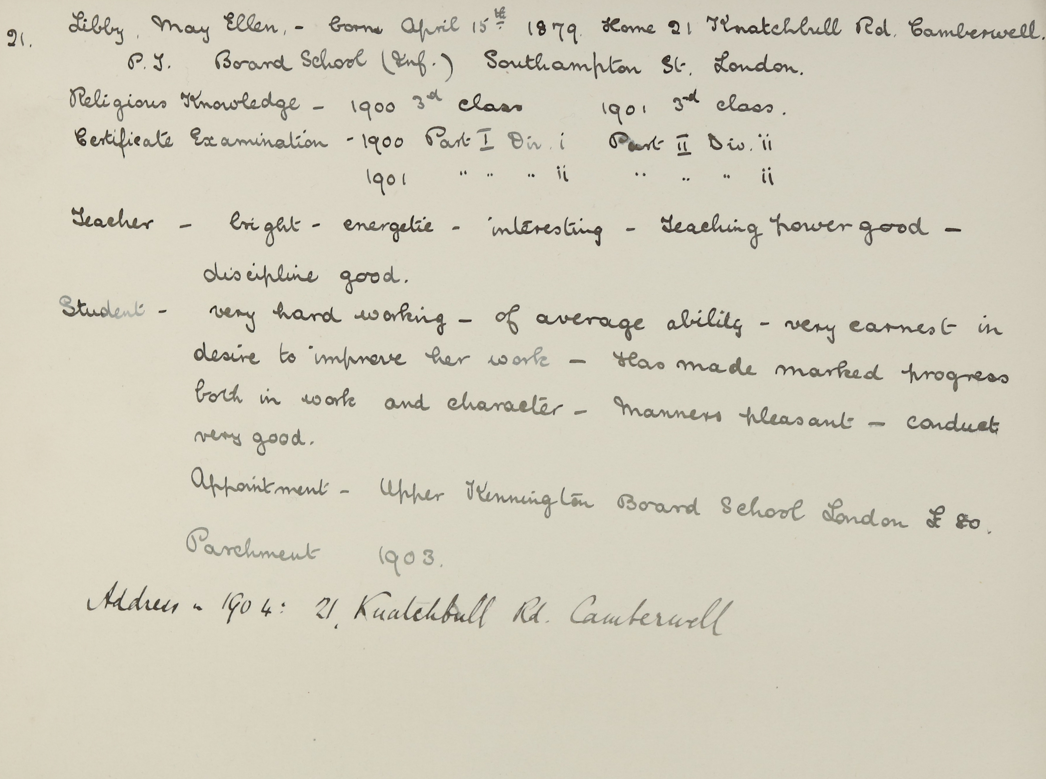 She is at 20 Holmdene Avenue, Camberwell. Her father is listed as ‘School Master Retired’. May is listed as ‘School Mistress’.