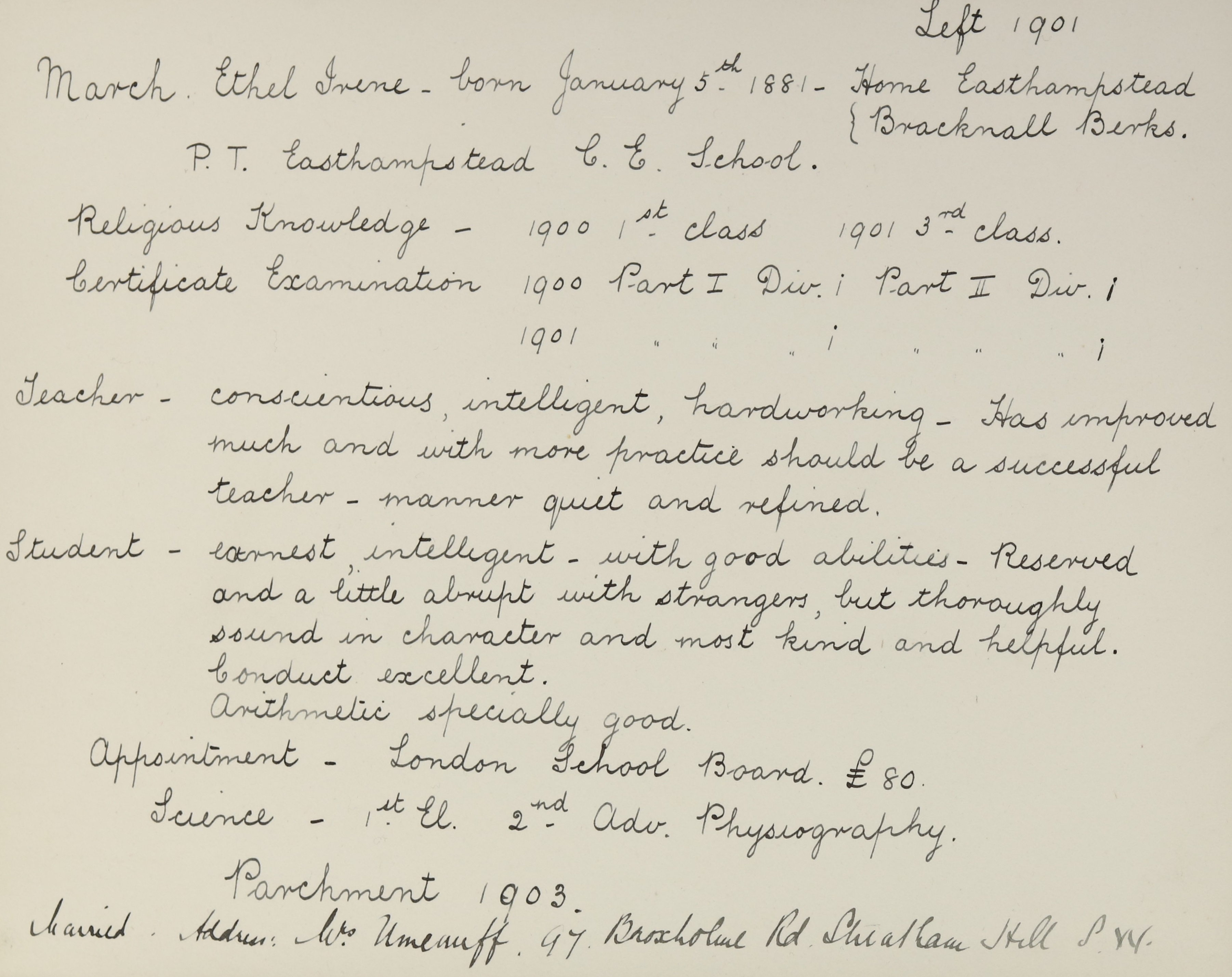 She is at School House, Hurst Lane, Berkshire. Her father is listed as ‘Schoolmaster and Organist’. Her mother is listed as ‘Schoolmistress’. Ethel and her brother, Sydney are unlisted. Her grandmother, Ann March (b. 1822) is listed as ‘Annuitant’. Her aunt, Emma J March (b. 1860), is unlisted.