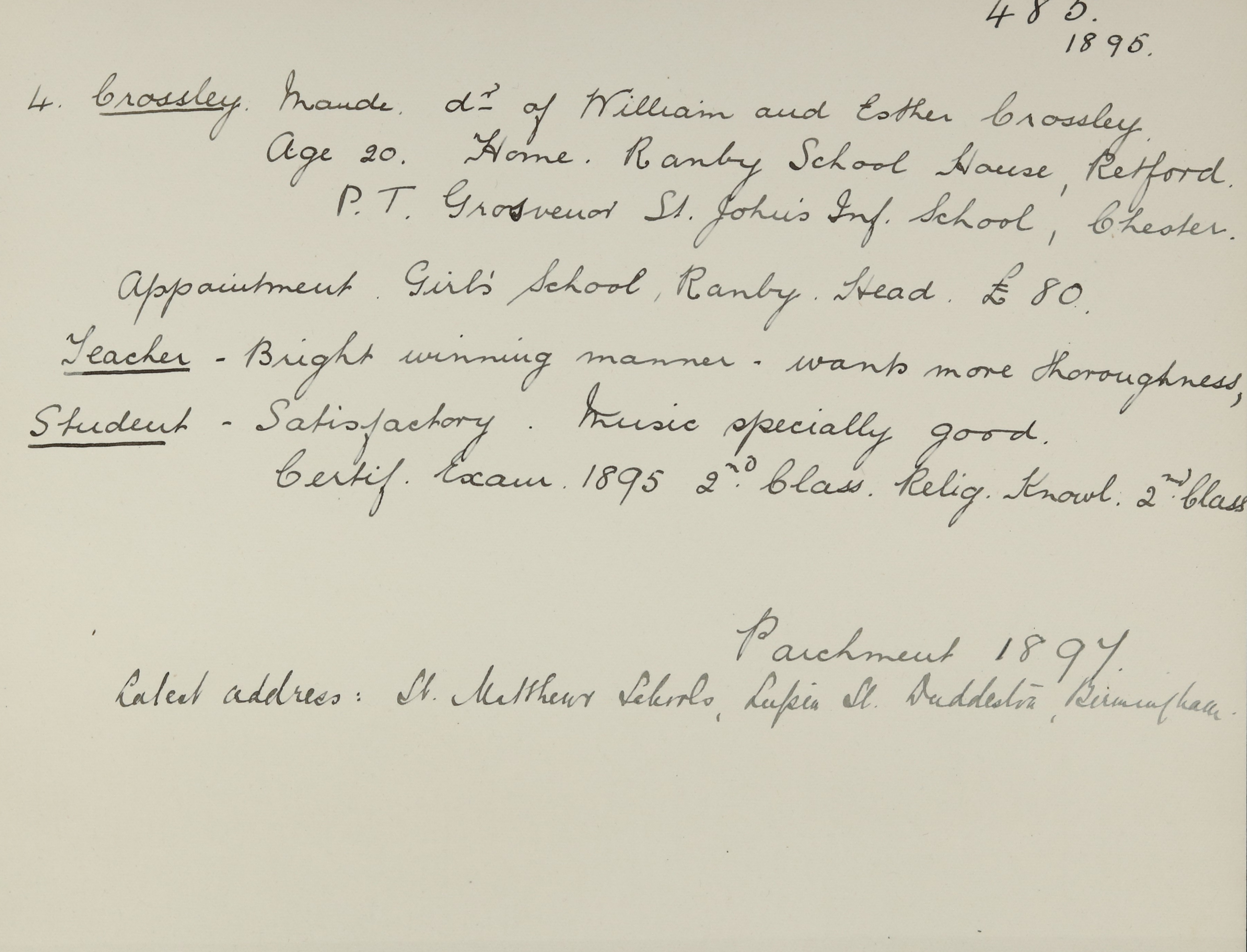 Appointed to Ranby Church School, Retford. Salary £66. Head.