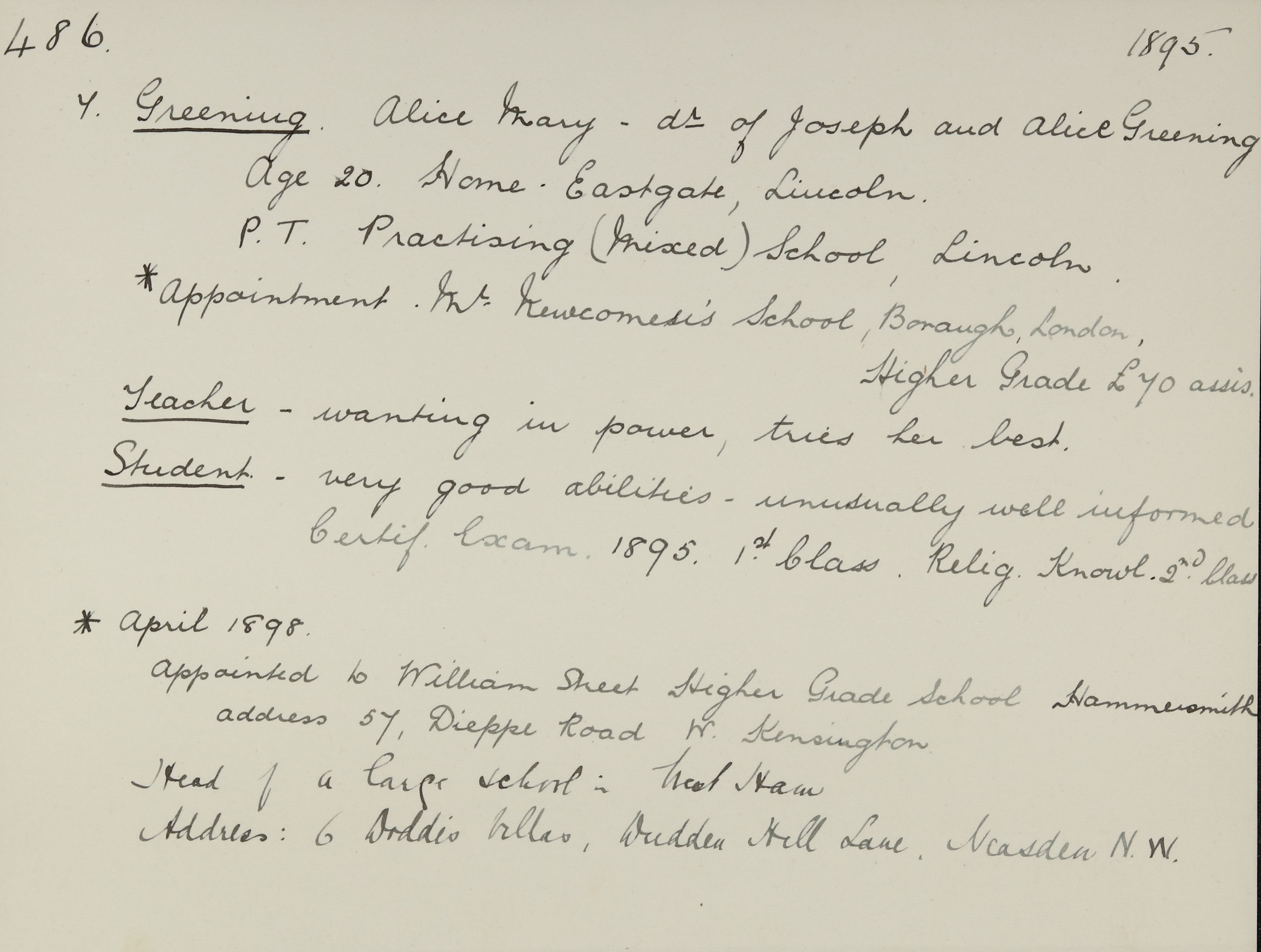Appointed to Mr. Newcomen's School, Borough, London. Salary £65. Assistant.