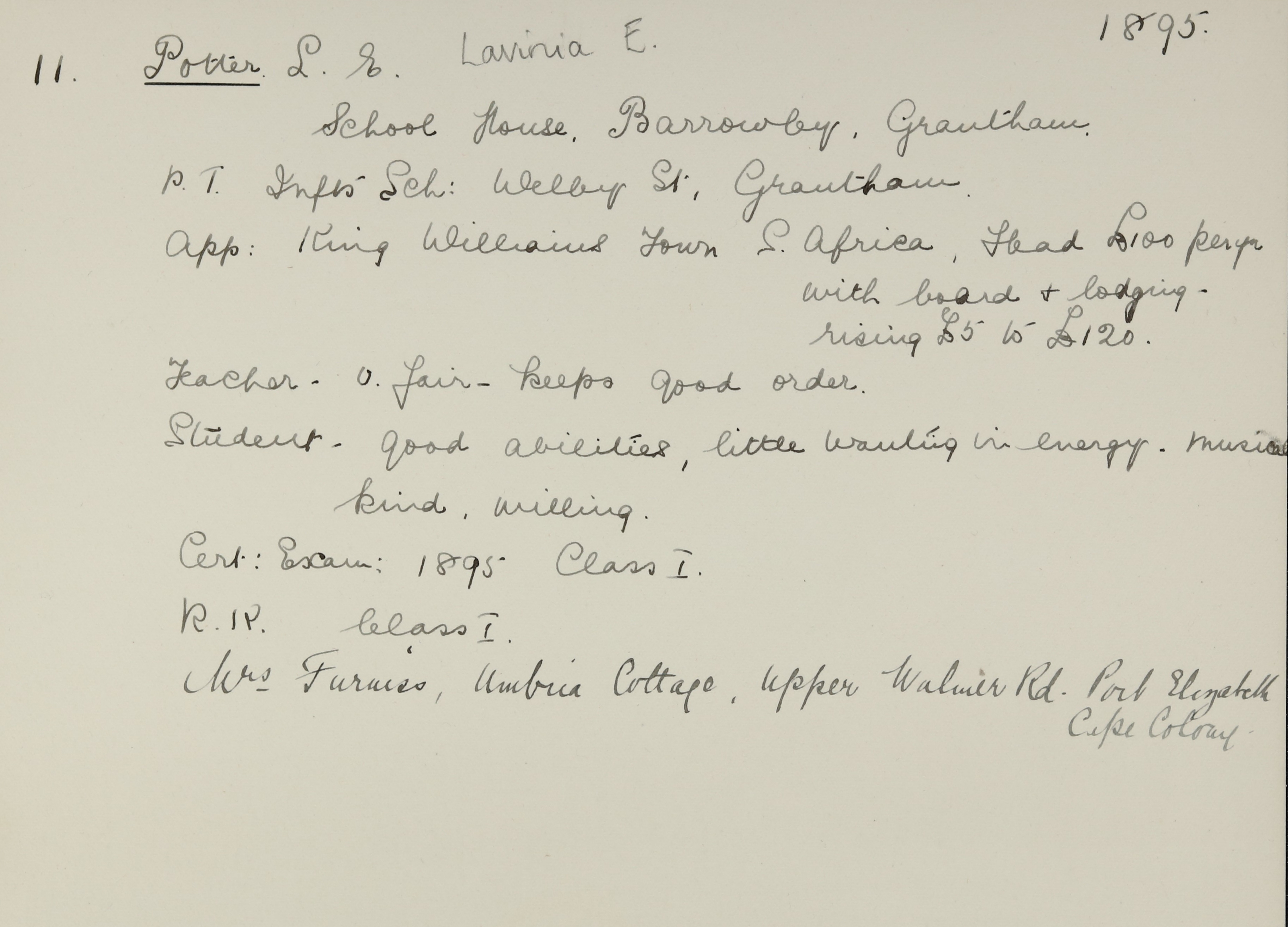 Appointed to King William's Town. South Africa. Salary £100. Head.