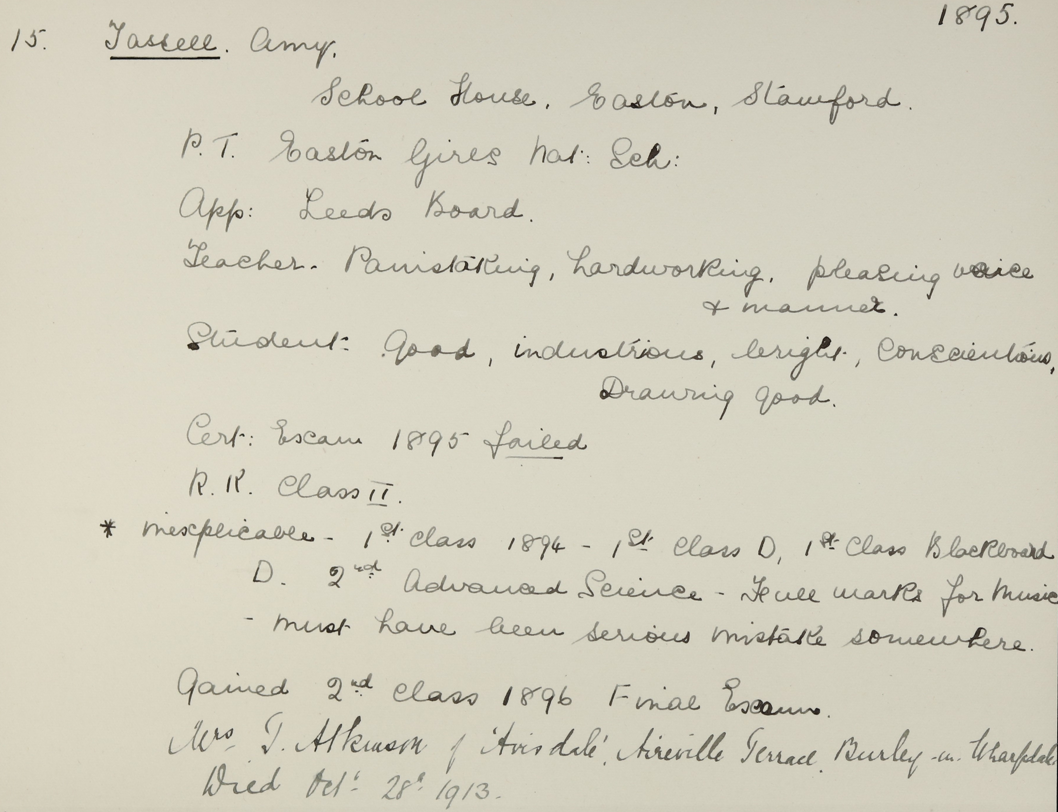 She is at Bell Street, Easton on the Hill, Stamford. Her father is listed as ‘Teacher Elementary School’. Amy is listed as ‘Pupil Teacher Elementary School’. Her mother and siblings (Edith, Grace and Wilfred) are unlisted. Her grandfather, James Edward Barr (b. 1822), is listed as ‘Retired Chairmaker’.