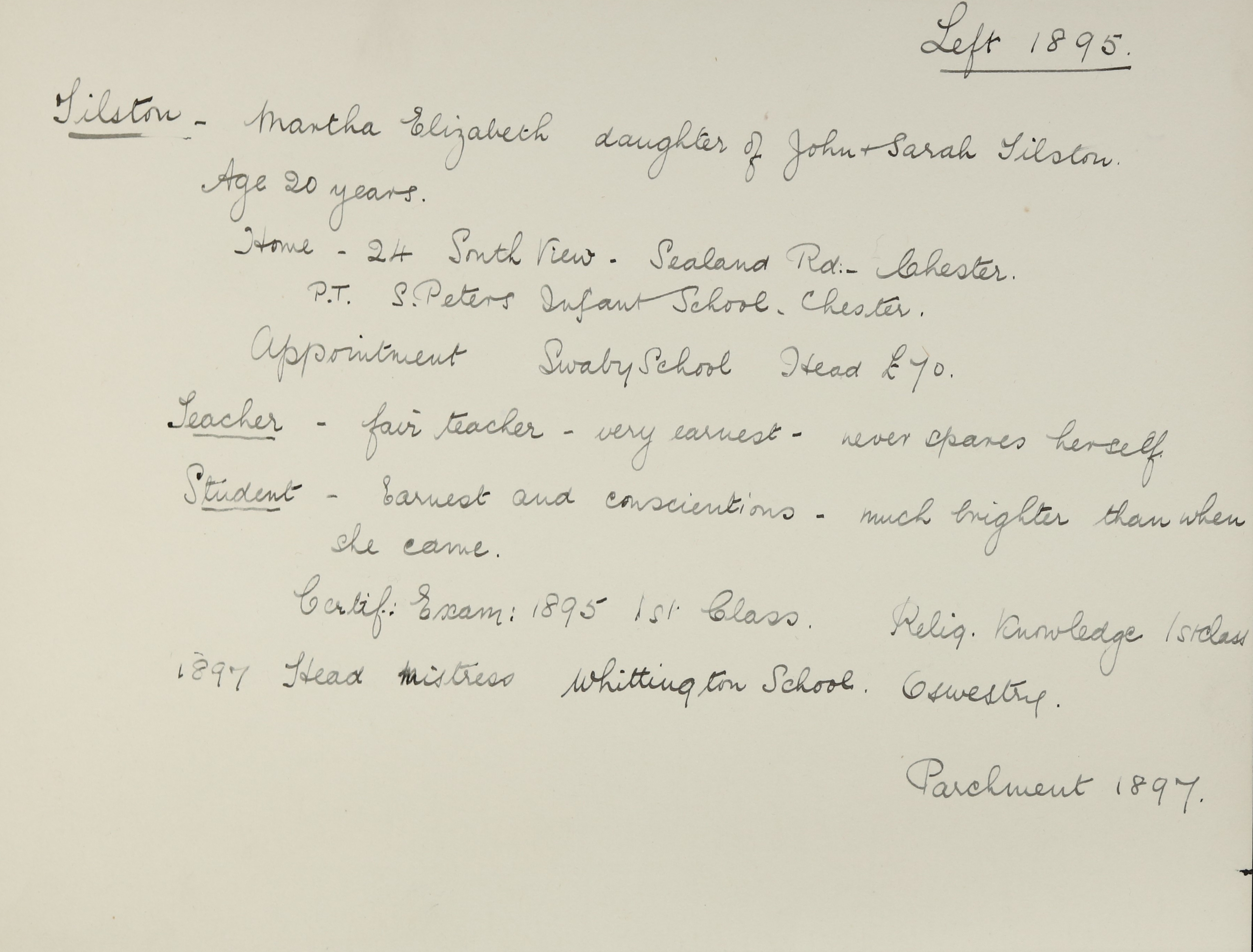 She is at Grey, Chester. Her mother is listed as widowed and ‘Retired’. Her sister, Hilda, now Hilda Jones, is an unlisted widow. Martha is listed as ‘Retired Schoolteacher’.