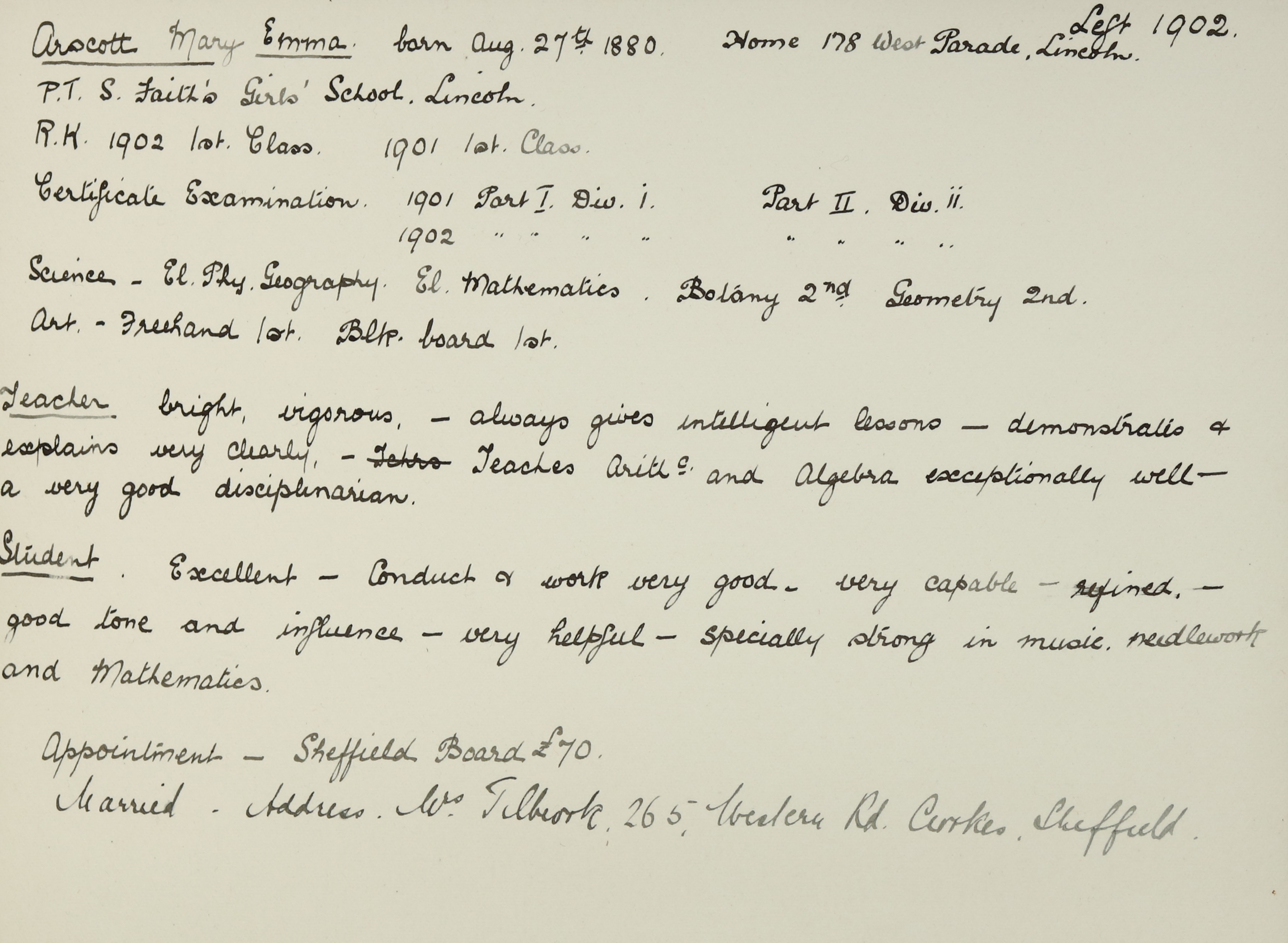 She is at 178 West Parade, Lincoln. Her father is listed as ‘Foreman Tailor’. Her mother and siblings (Joseph and Sarah) are unlisted. Mary is listed as ‘Student in Training College’. Her sister, Margaret, is listed as ‘Pupil Teacher’. Her brother, William, is listed as ‘Mechanical Engineer’s Apprentice’.
