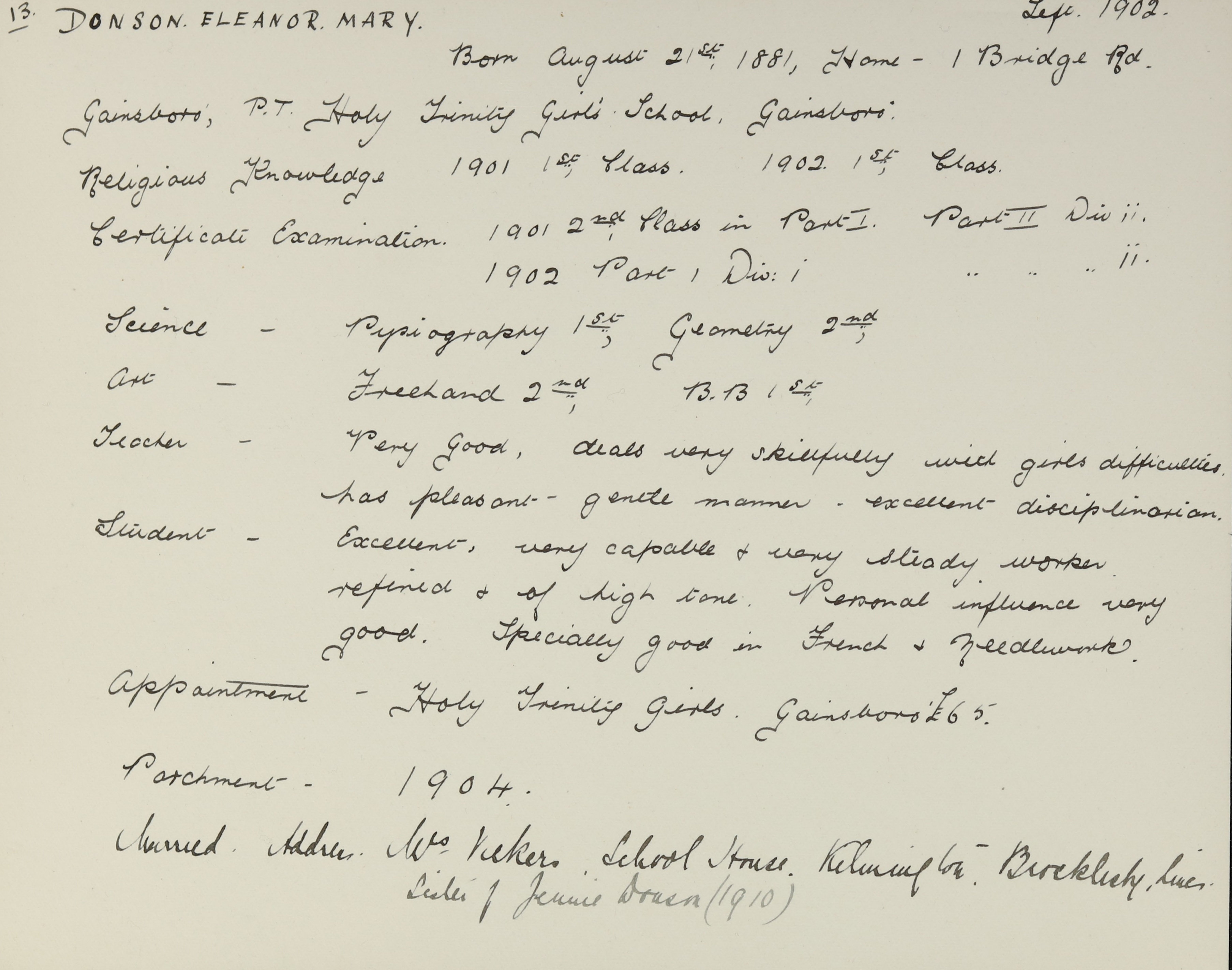 She is at 1 Bridge Road, Gainsborough. Her father is listed as ‘Joiner and Carpenter’. Her stepmother, sister Jane and half-siblings (Elizabeth, George and Edgar) are unlisted. Eleanor is listed as ‘Student Lincoln Schoolmistress Training College’. Her brother, Arthur, is listed as ‘Apprentice to Iron Turning’. Her cousins, Arthur R Donson (b. 1888) is unlisted. There are two servants: Alice Forrest (b. 1881) and Edith Forrest (b. 1886).