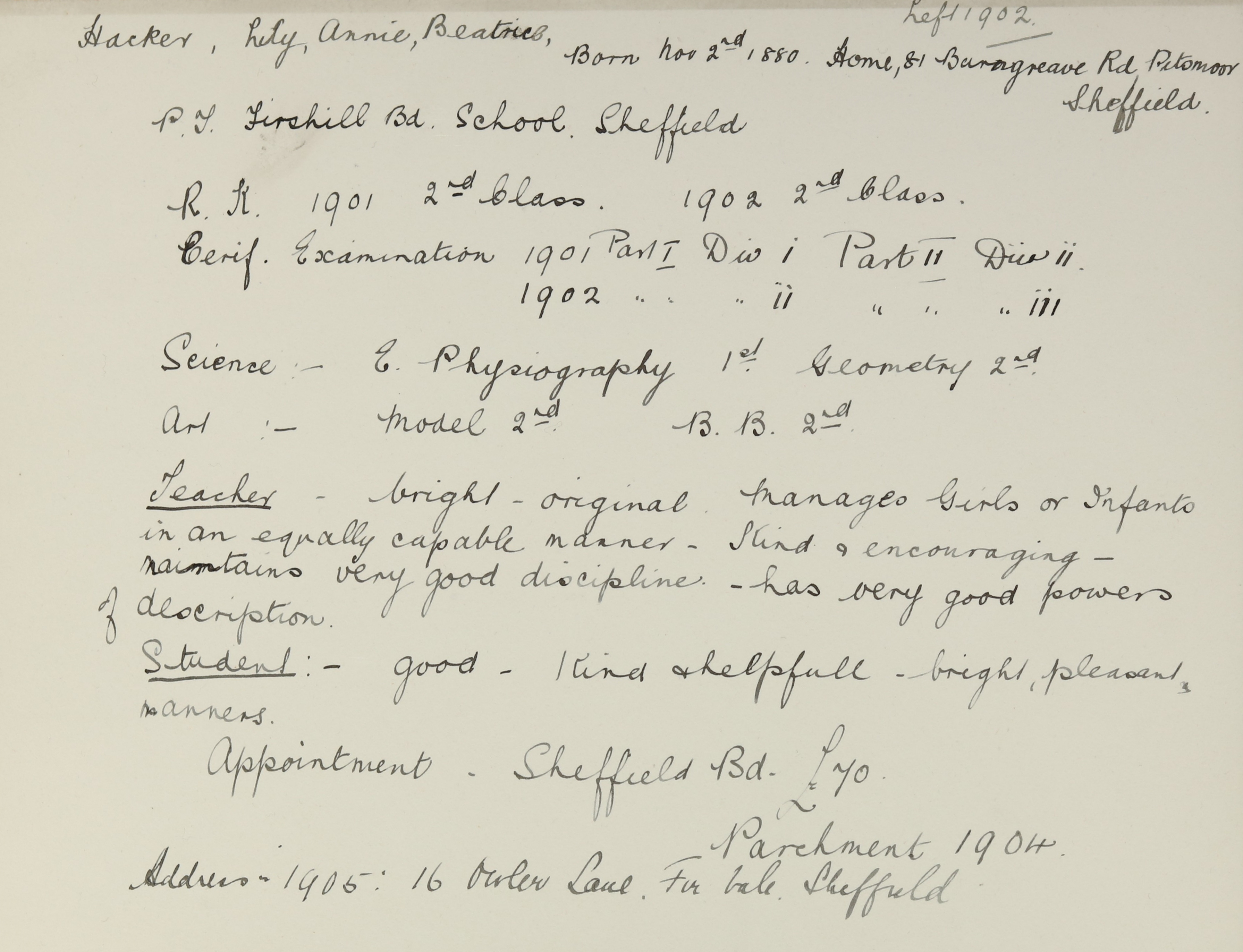 Sisters: Frances Elizabeth Hacker (b. 1867), Edith Fanny Hacker (b. 1875), Gertrude Alice Hacker (b. 1877), Mabel Elsie Hacker (b. 1885) [LDTC 1906], Gladys May Hacker (b. 1886)