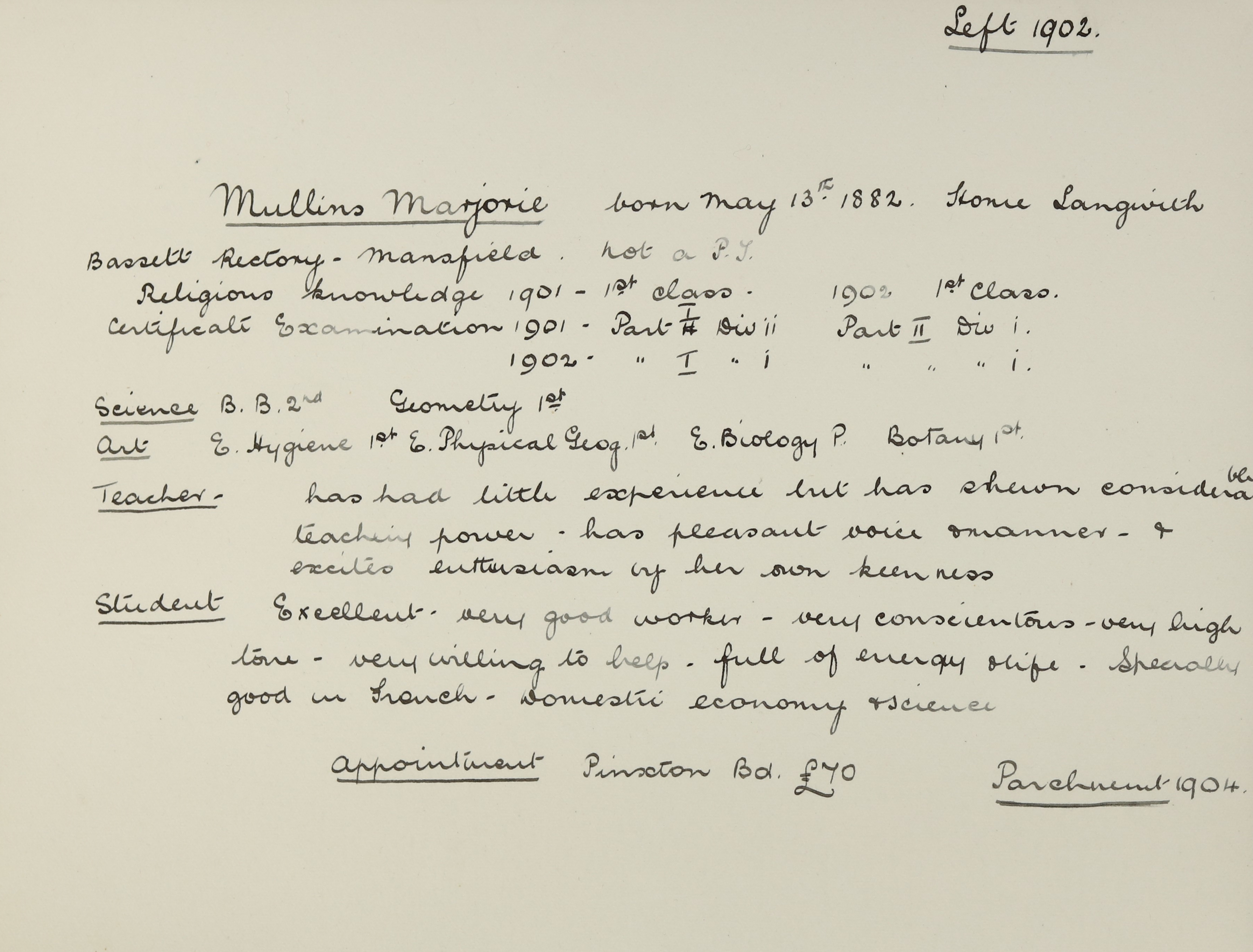 She is The Rectory, Upper Langwith, Mansfield. Her father is listed as ‘Priest of Church of England’. Marjorie, her mother and her siblings (Dorothy, Mary and Ciceley) are unlisted. There are two servants, Fanny Oxley (b. 1882) and Elizabeth Meads (b. 1885).