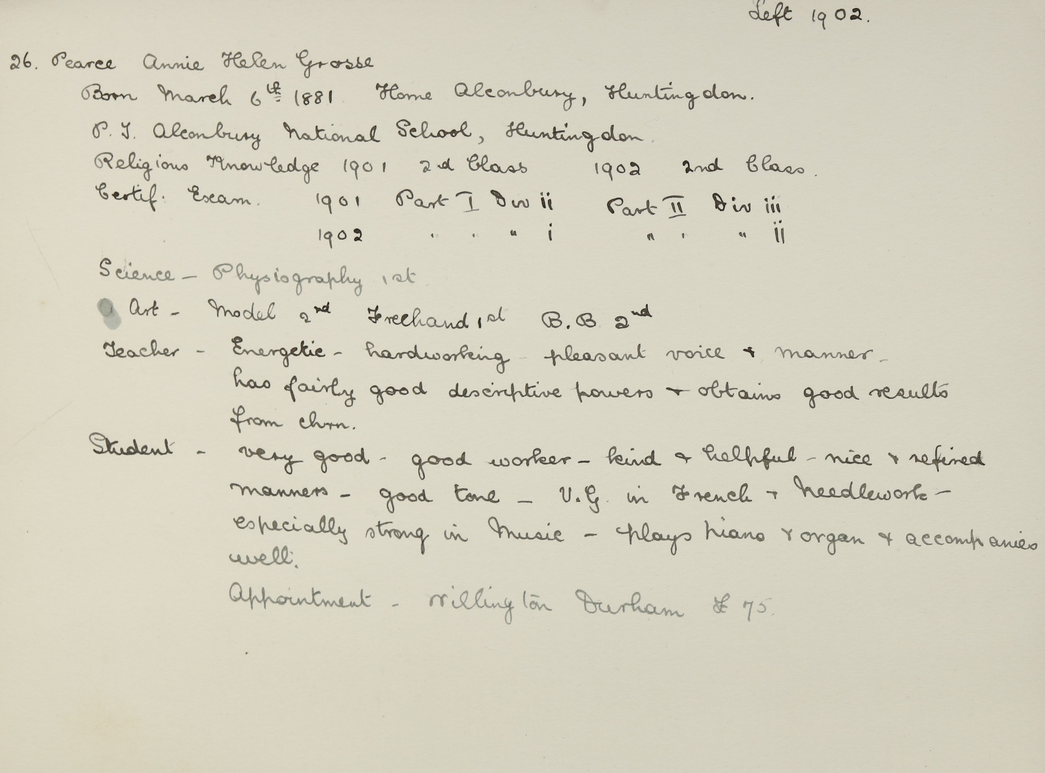 She is at The School, School Way, Alconbury, Huntingdon. Her father is listed as ‘Schoolmaster’. Her mother is listed as ‘Schoolmistress’. Annie is listed as ‘Student of Lincoln College’. Her brother, William, is listed as ‘Pupil Teacher’. Her brothers, Harold and Gerald, are unlisted. Her grandmother, Annie E Grosse (b. 1830), is an unlisted widow.