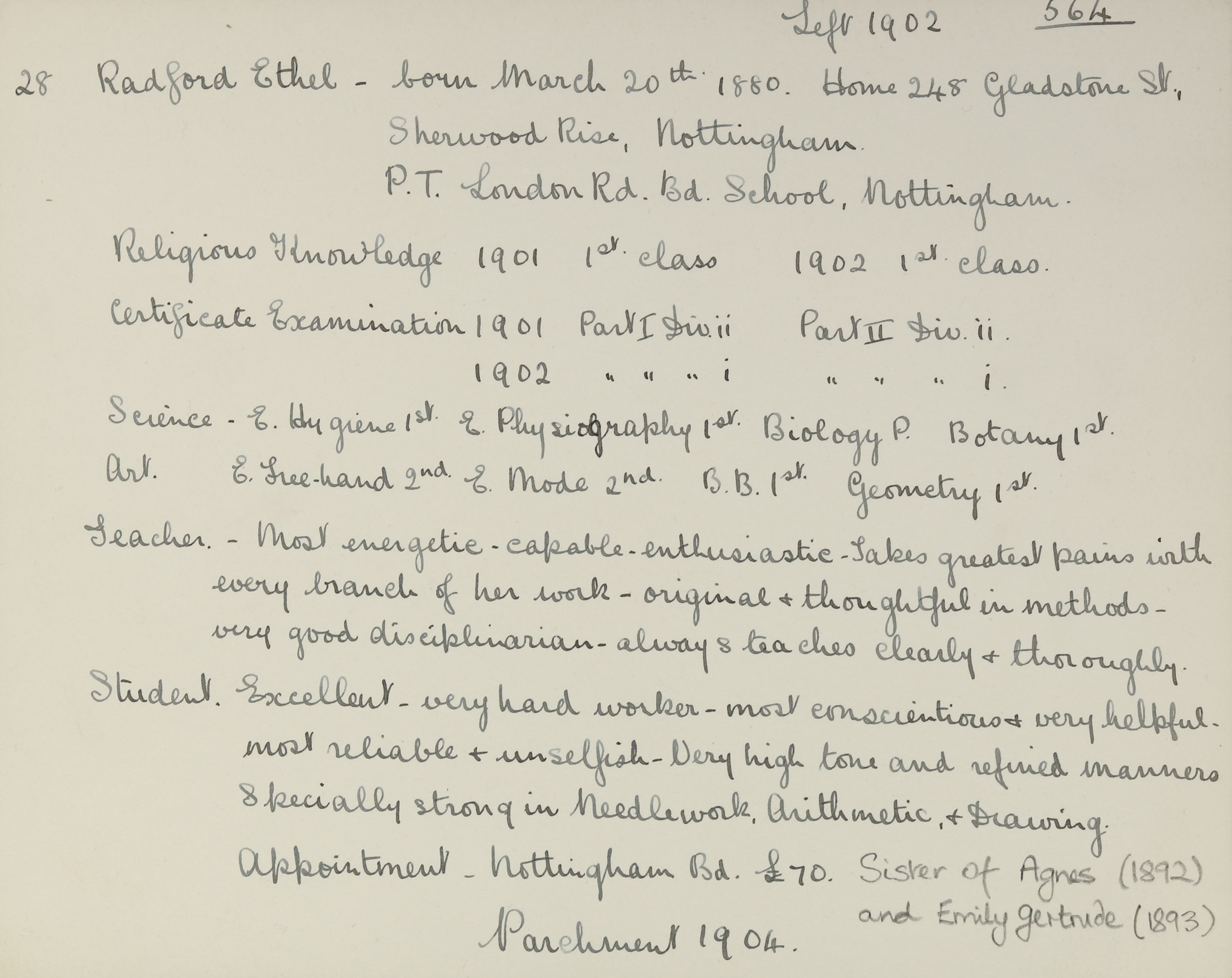 She is at 248 Gladstone Street, Nottingham. Her mother is unlisted. Ethel and her sister, Emily, are listed as ‘Assistant Teachers’. There is a servant, Ruth Thorpe (b. 1890).