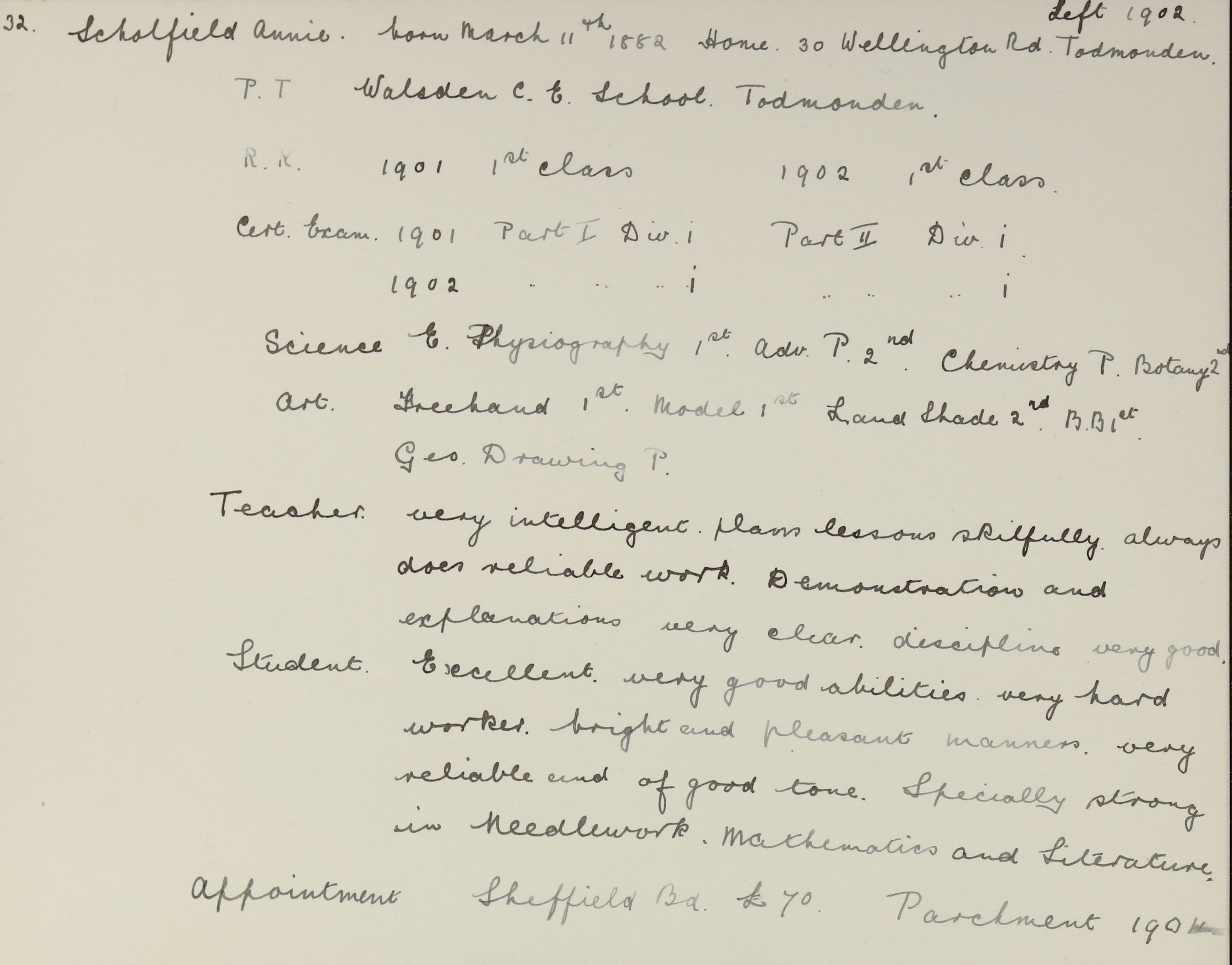 She is at 30 Wellington Road, Todmorden, Yorkshire. Her father is listed as ‘French Polisher’. Her mother is unlisted. Her brother, John, is listed as ‘Draughtsman At Iron’. Annie is listed as ‘Student in College’.