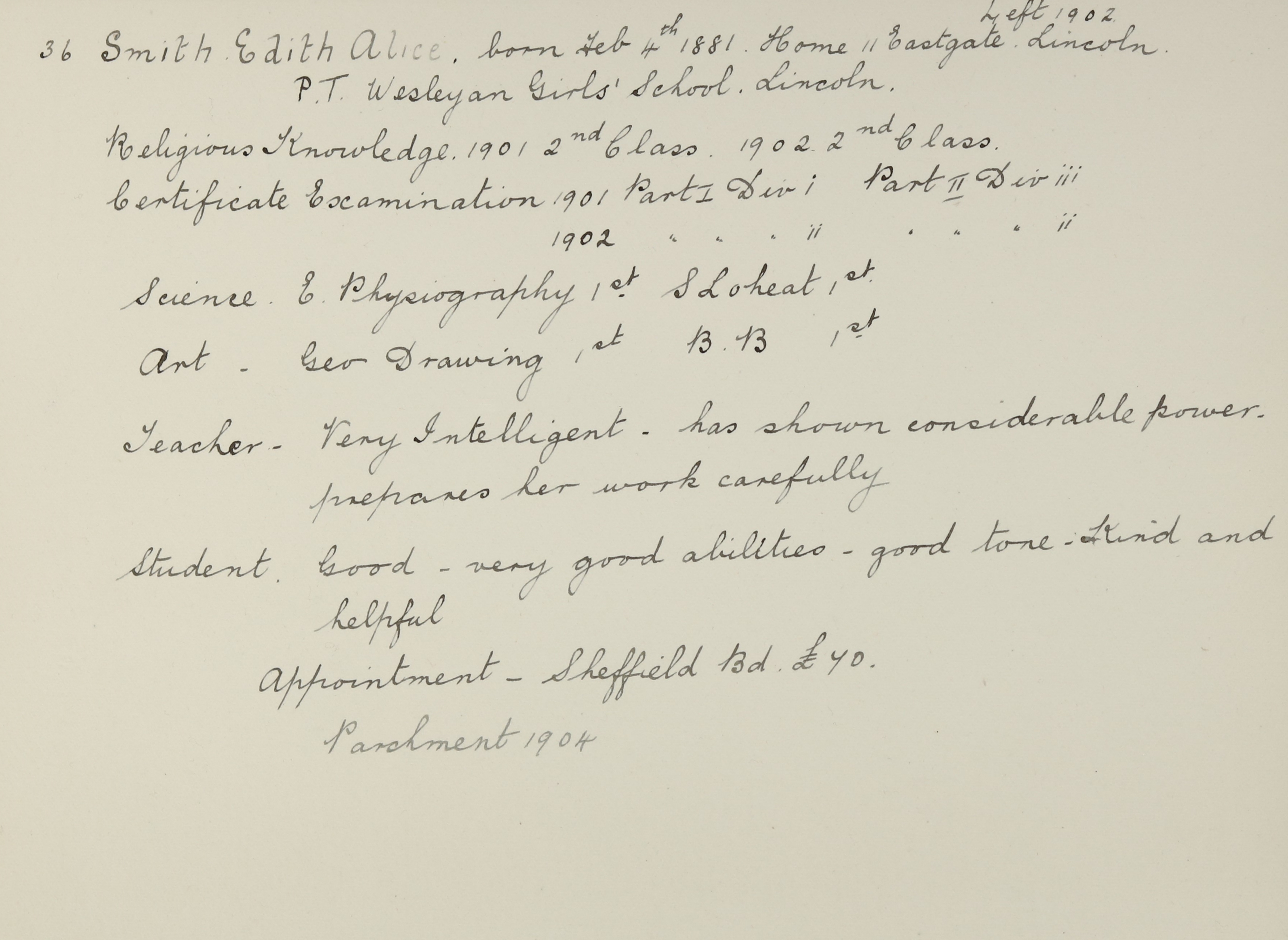 She is at 16 May Crescent, Lincoln. Her father is listed as ‘widower’ and ‘Retired Joiner’. Edith and her sister, Agnes, are listed as ‘Elementary School Teacher’.
