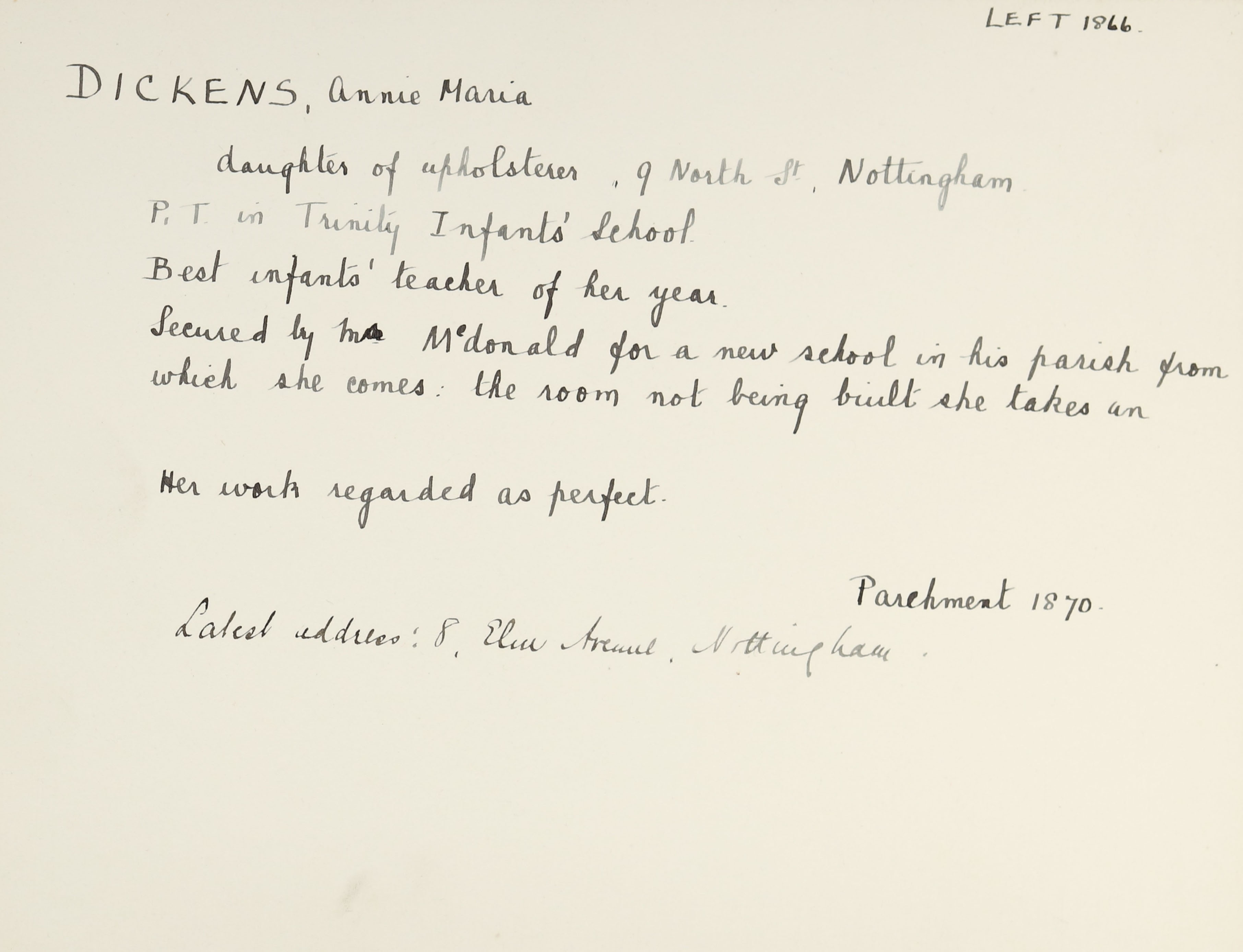 She is at North Street, Nottingham. Her father and brother, John, are listed as ‘Upholsterer’. Her mother and aunt, Emily Marlow (b. 1831), are unlisted. Annie is listed as ‘Schoolmistress’. Her brother, Arthur, is listed as ‘Solicitors Clerk’. Her sister, Rosina, is listed as ‘Pupil Teacher’.