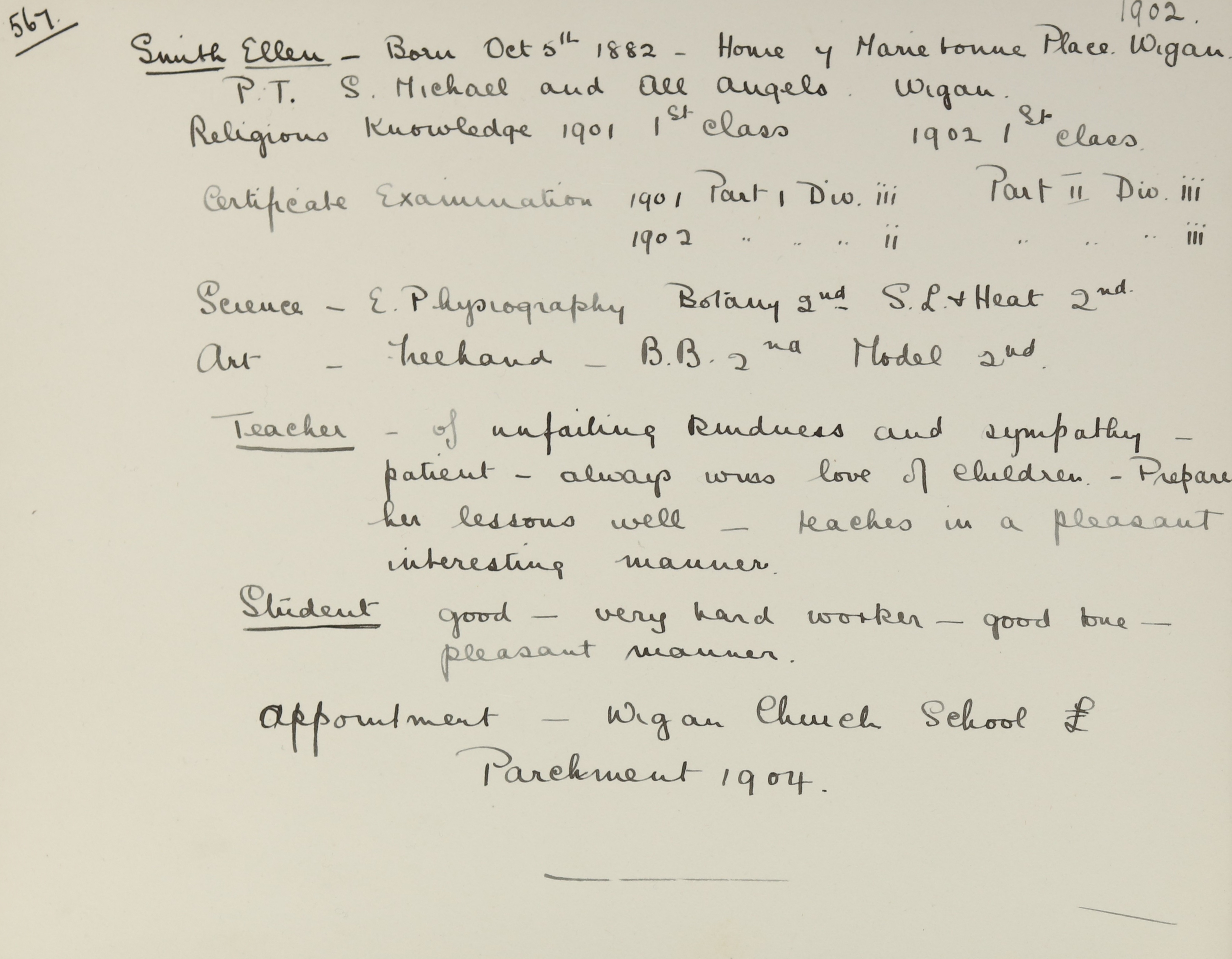 She is at 7 Mariebonne Place, Wigan, Lancashire. Her father is listed as ‘Teamster on Farm’. Her mother and brother, Arthur, are unlisted. Her brother, John, is listed as ‘Colliery Wagon Weigh Clerk’. Ellen is listed as ‘Student’. Her brother, Jesse, is listed as ‘Assistant Master Elementary’.