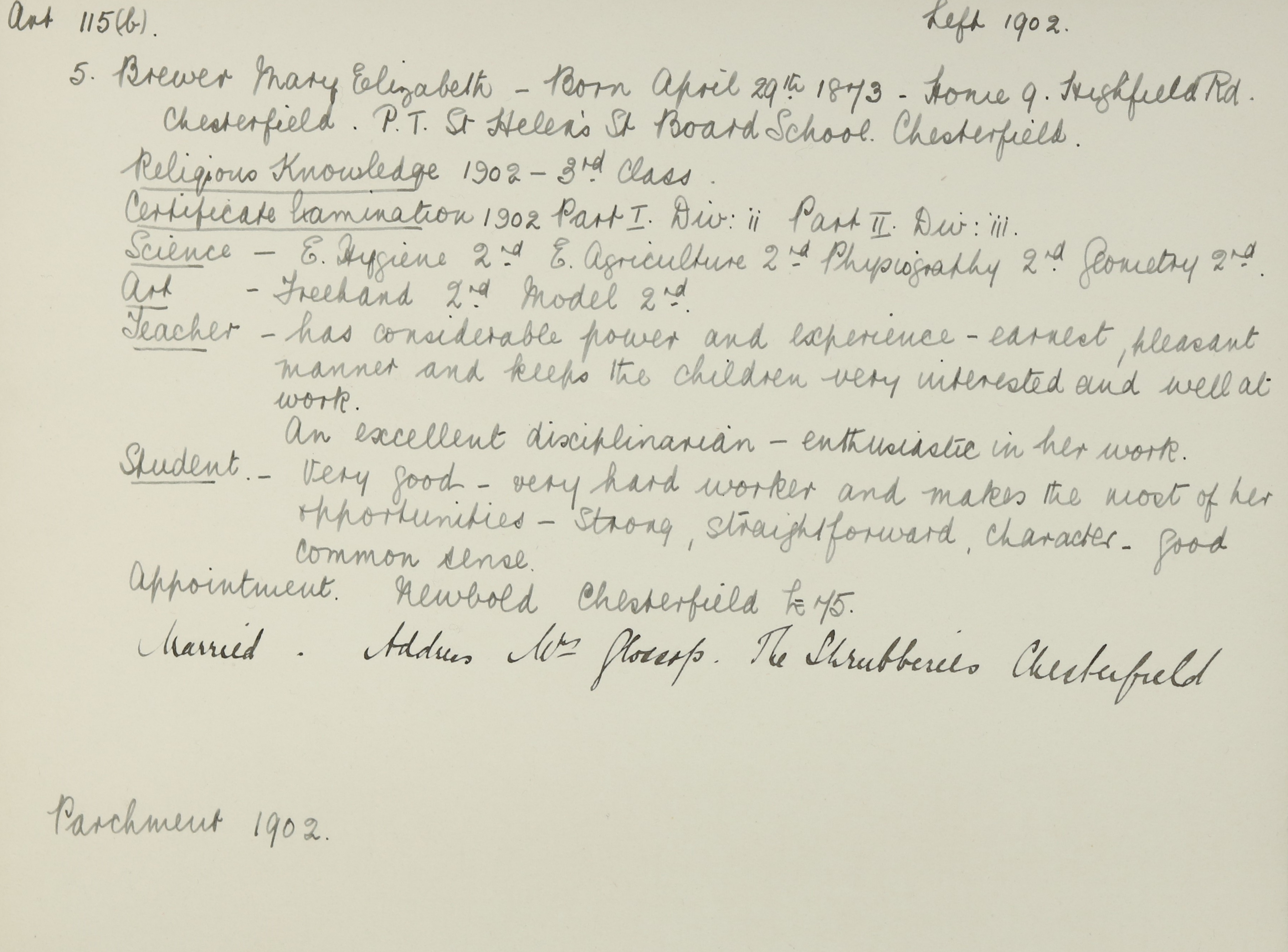 She is at 9 Highfield Road, Chesterfield. Her father is listed as ‘Currier’. Her stepmother, Mary E Brewer (b. 1838) is unlisted. Mary is listed as ‘School Teacher’. William Dixon (b. 1878), is a boarder, listed as ‘Electrician’.