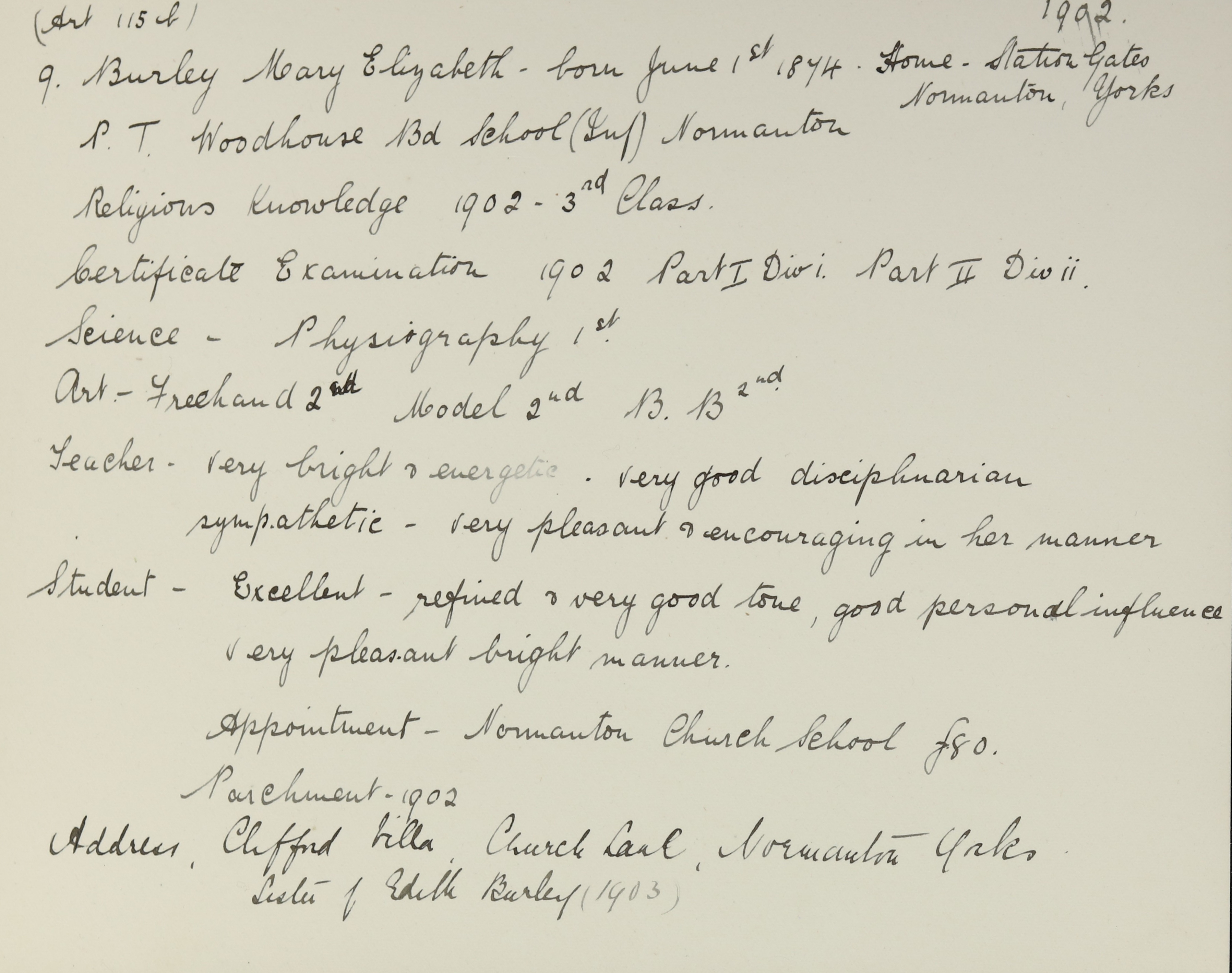 She is at 109 Church Lane, Normanton. Her father is listed as ‘Assistant Station Master’. Her mother is unlisted. Mary and her sister, Francis, are listed as ‘Head Teacher’. Her sister, Edith, is listed as ‘Assistant Teacher’.
