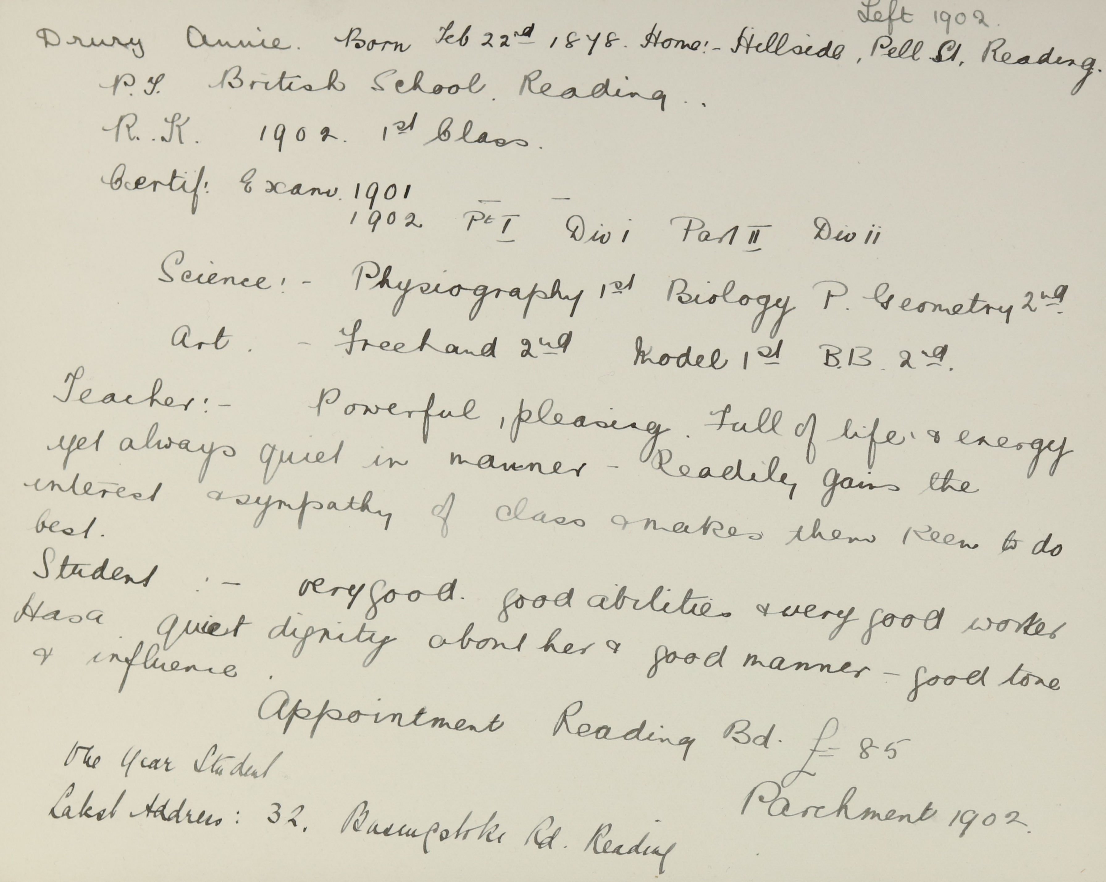 She is at 12 Christ Church Road, Reading. Her friend, Sarah Ann Holt Fabry (b. 1864), is listed as ‘Assistant Teacher Elementary’. Annie is listed as ‘Head Teacher Elementary’.