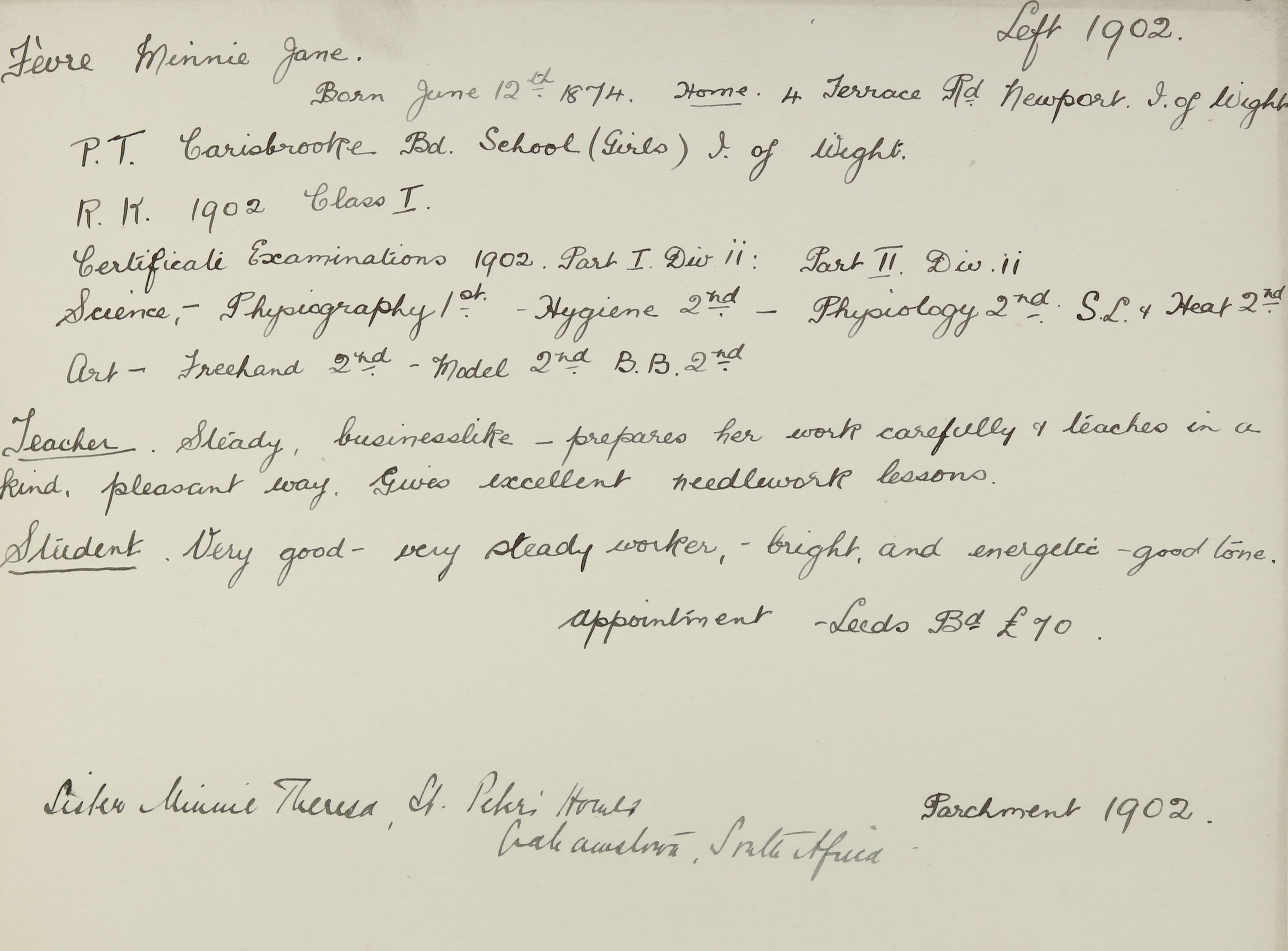 She is at Watergate Road, Carisbrooke, Isle of Wight. Her father is listed as ‘Gardener’. Her mother, brother, Albert and nephew, Thomas W Févre (b. 1889) are unlisted. Her sister, Mary, is listed as ‘Dressmaker’. Her brother, Richard, is listed as ‘Assistant Schoolmaster’. Her sister, Rose, is listed as ‘Certified School Mistress’. Minnie is listed as ‘Pupil Teacher’.