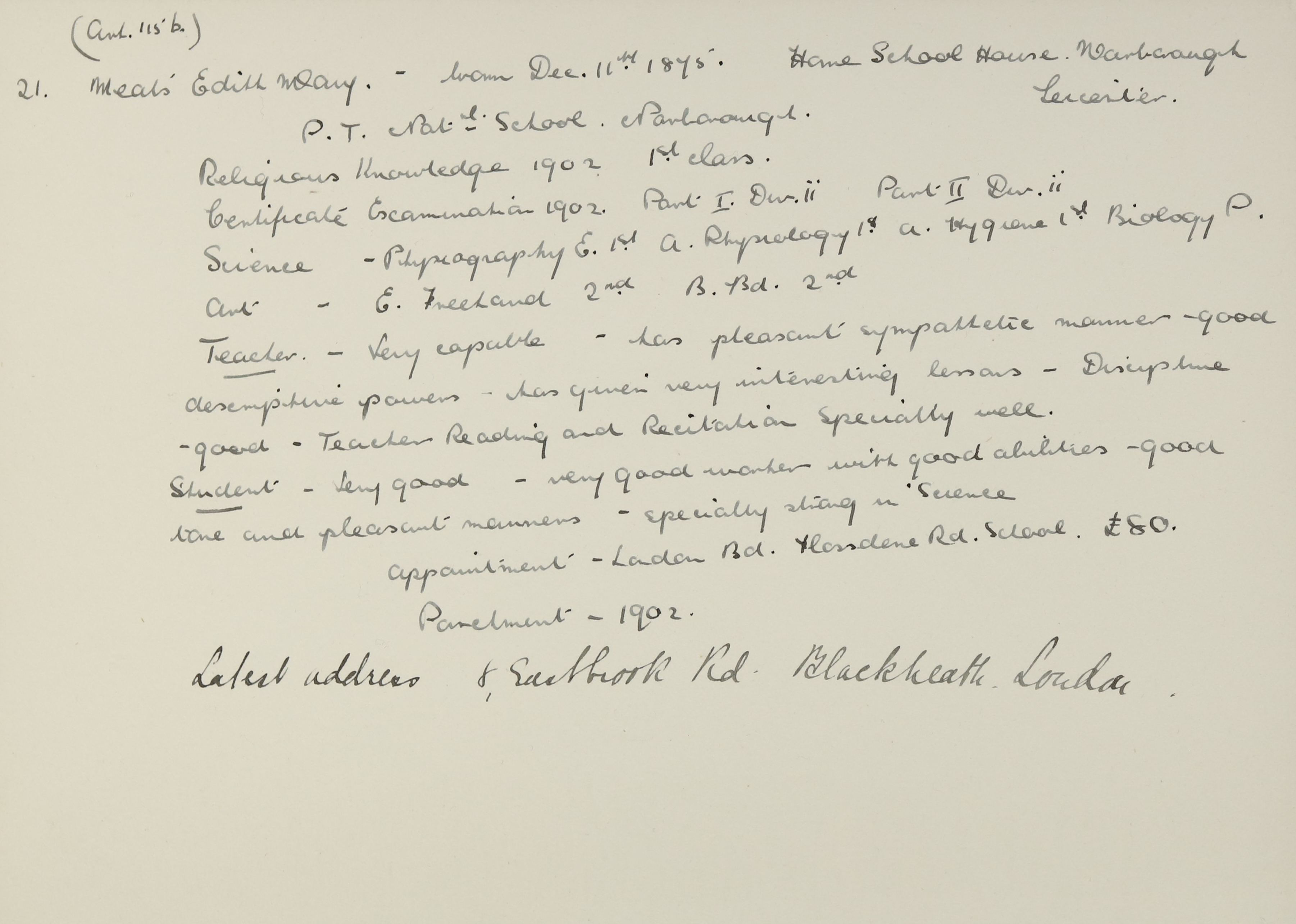 Appointed to Fossdene Road Board, London. Assistant. £80.