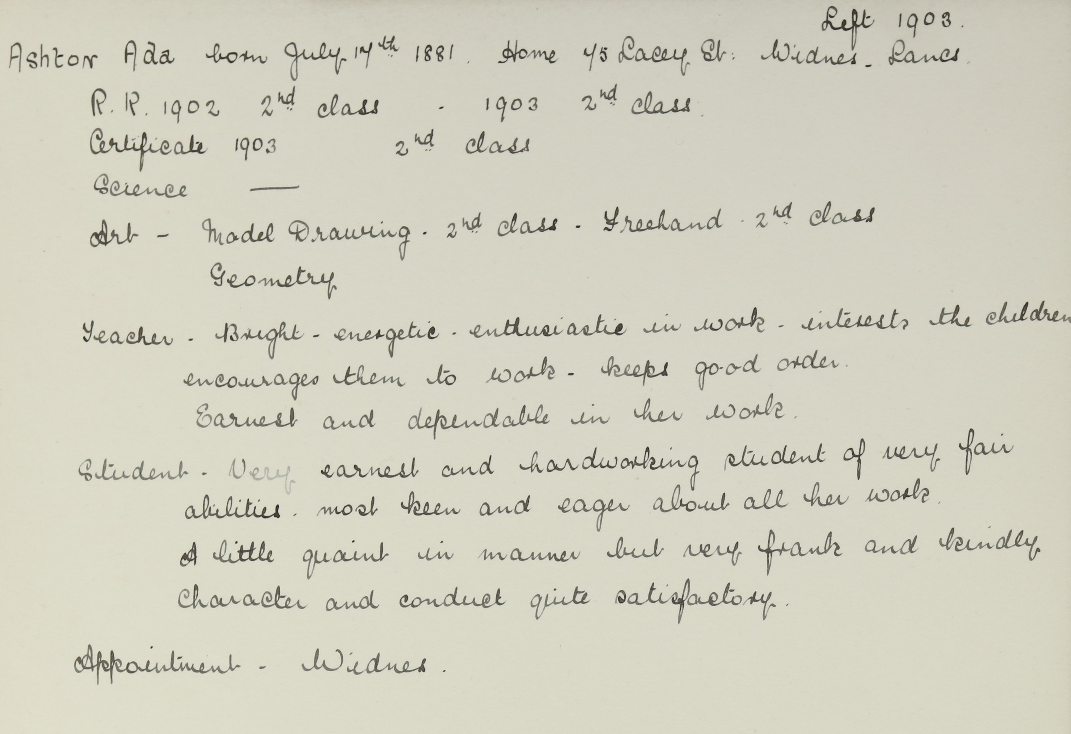She is at 75 Lacey Street, Widnes, Prescot, Lancashire. Her father is listed as ‘Chemical Labourer’. Hermother is unlisted. Ada is listed as ‘Pupil Teacher’. Her brother John is listed as ‘Copper Works Office Boy’.