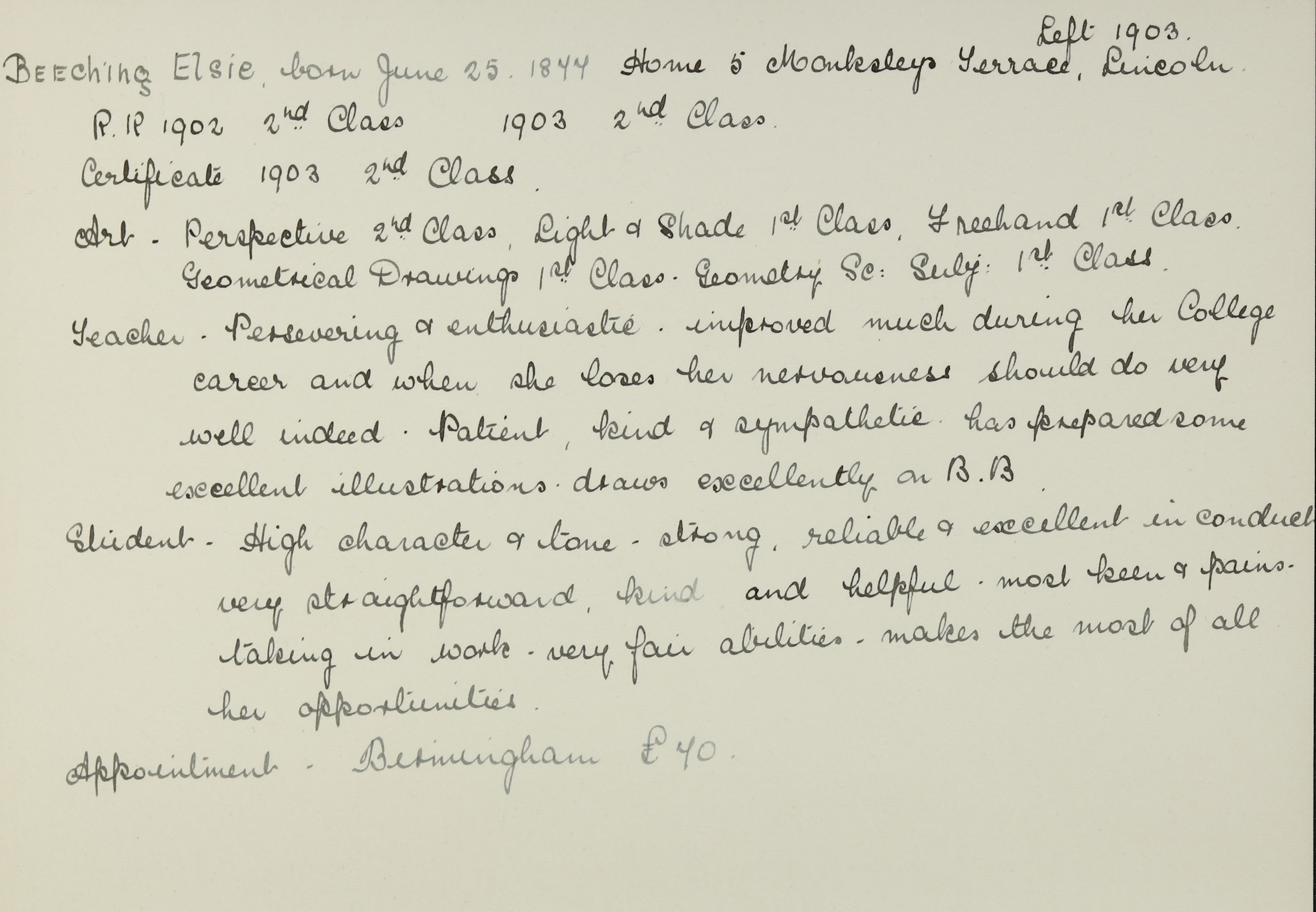 She is at 5 Monk Lets Terrace, Lincoln. Her mother is an unlisted widow. Her brother, Frank, is listed as ‘Engineers Draughtsman’. Her brother, Harry, is listed as ‘Engineers Apprentice’. Elsie is listed as ‘School Teacher’. There is a boarder, Walter Lewin (b. 1880), listed as ‘Engineers Draughtsman’. Samuel Beeching (b. 1891), her cousin, is unlisted.