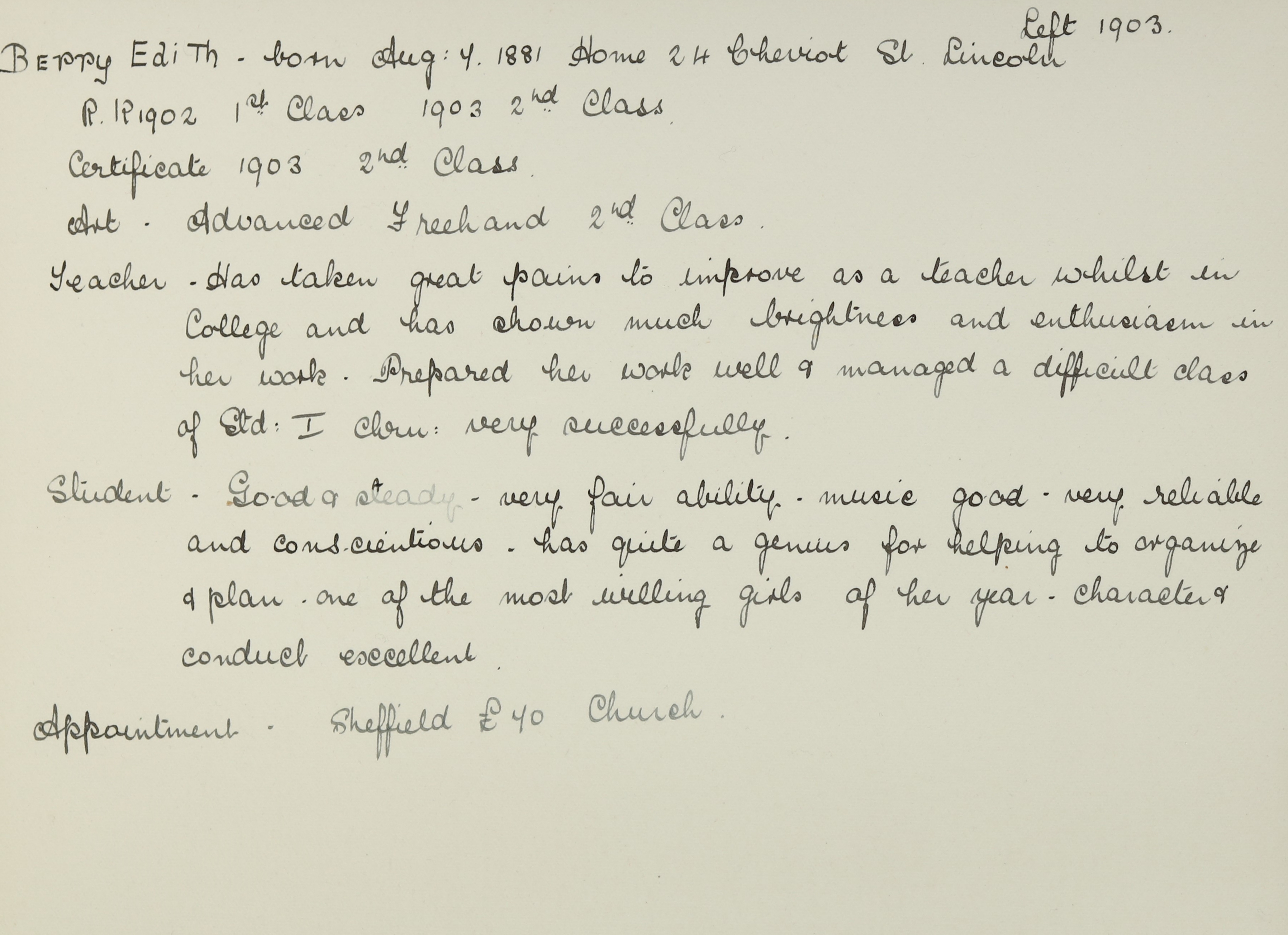 She is at 24 Cheviot Street, Lincoln. Her father is listed as ‘Joiner’. Her mother is unlisted. Edith is listed as ‘School Teacher’.