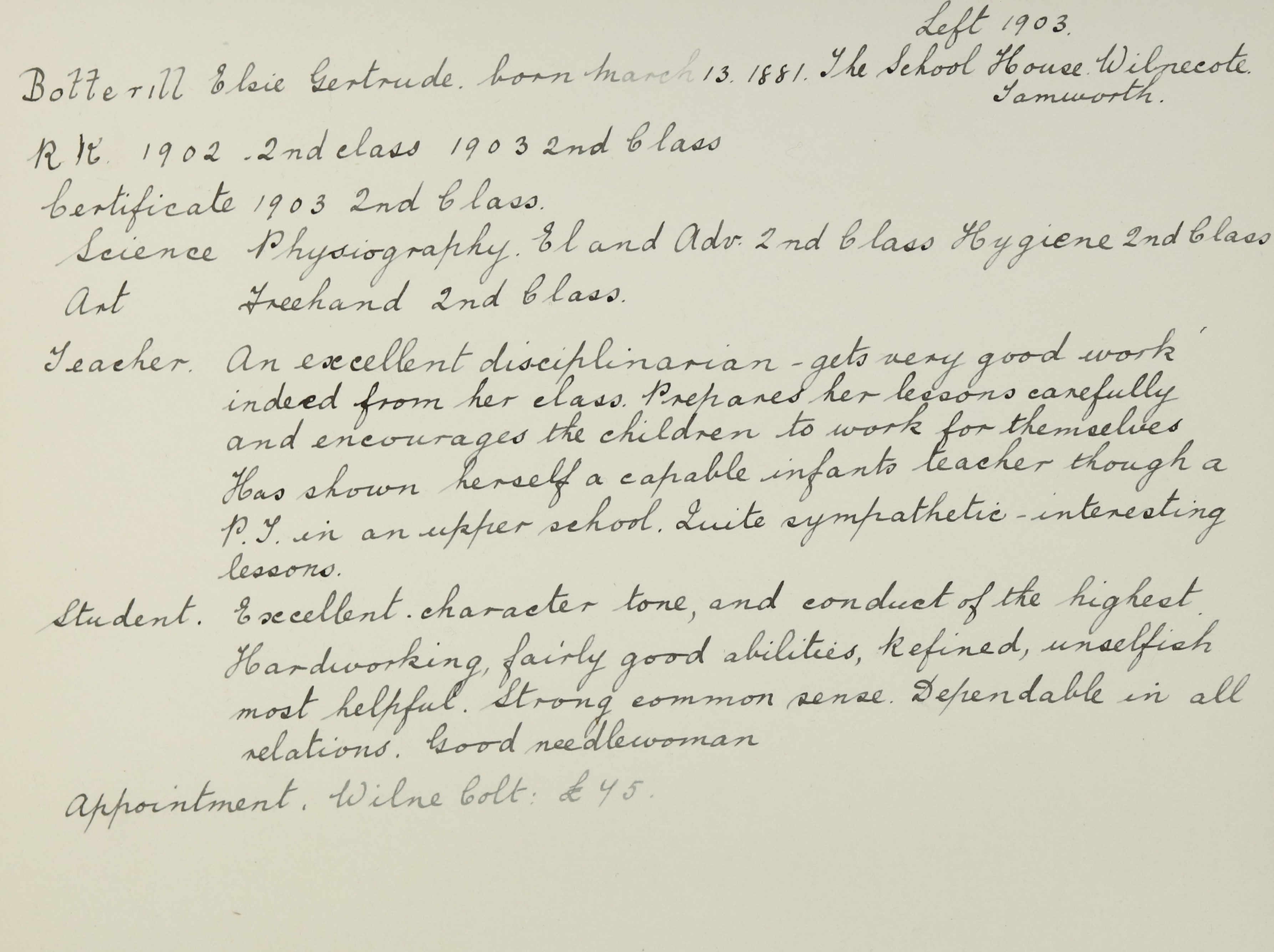 She is at School House, Hockley Road, Wilnecote, Tamworth. Her father is listed as ‘Schoolmaster’. Her mother is listed as ‘Schoolmistress’. Her sister, Constance, is listed as ‘Pupil Teacher’. Elsie is unlisted. There is a servant, Selina Bird (b. 1874).