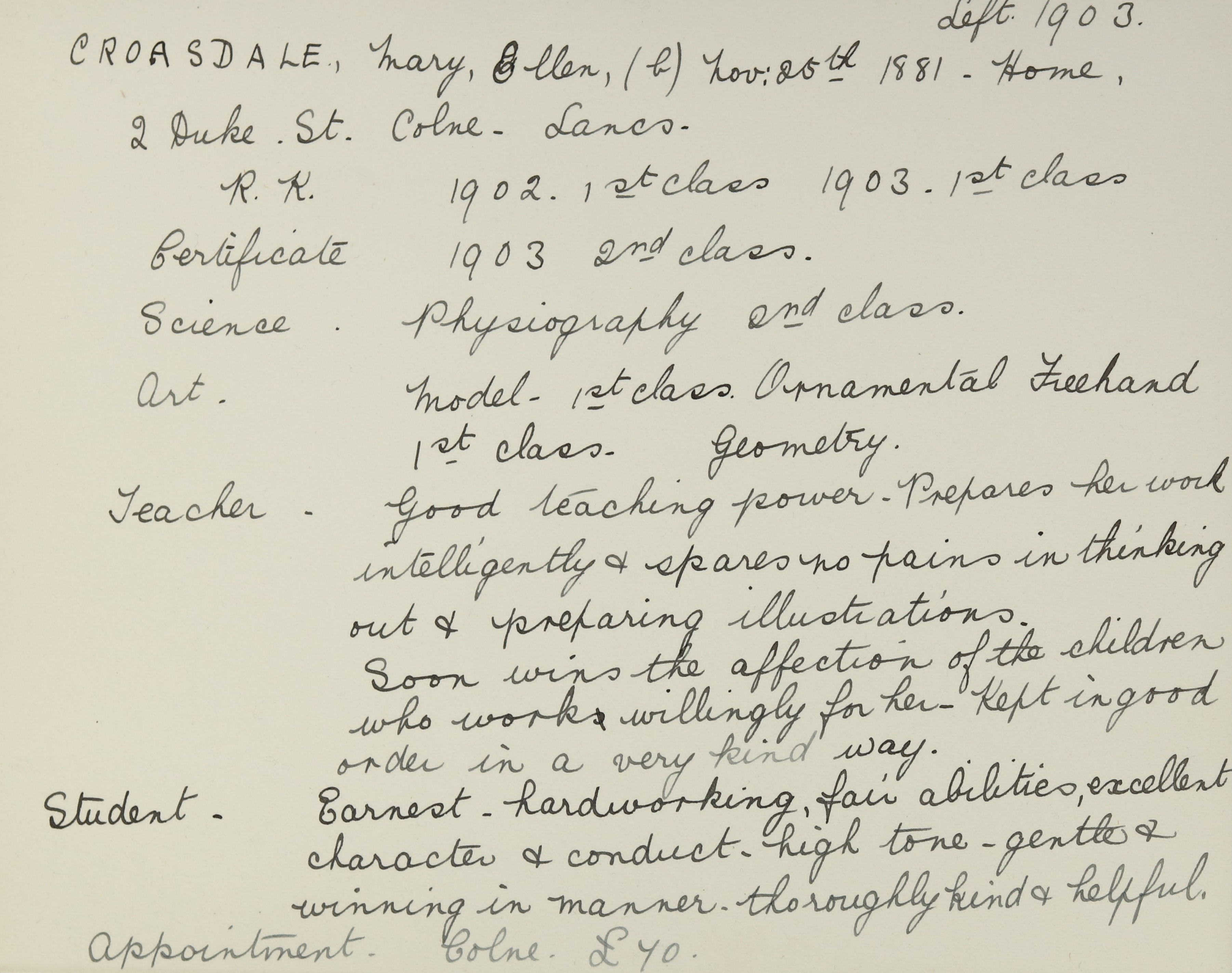 She is at 2 Duke Street, Colne, Lancashire. Her father is listed as ‘Foreman Loom Maker’. Her mother is unlisted. Mary is listed as ‘Trained Certificated Teacher Assistant’.