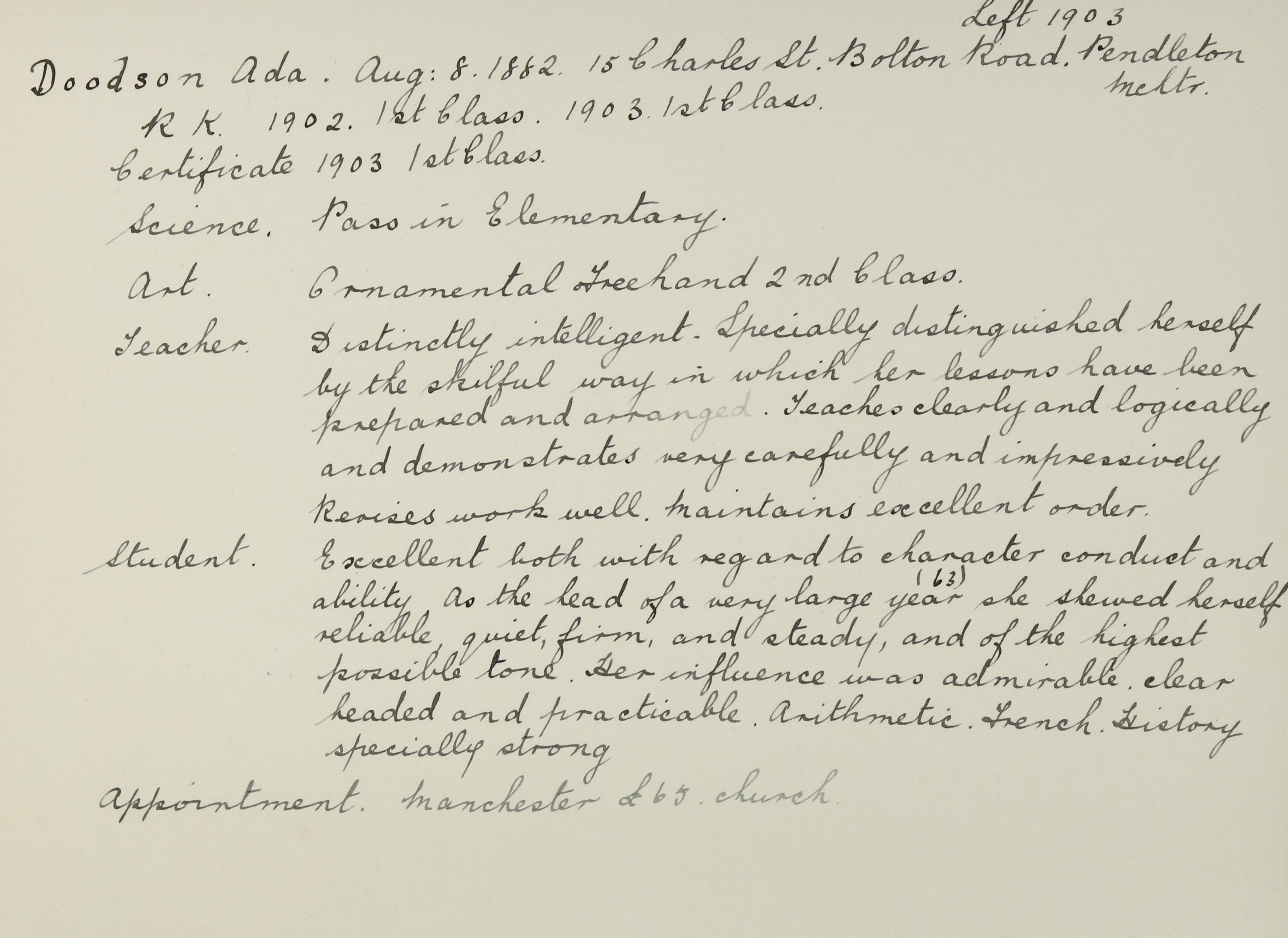 She is at 15 Charles Street, Pendleton, Salford. Ada is the head of the house. Ada and her and her sister, Elizabeth, are listed as ‘Certificated Teacher Elementary School’. Her brother, Henry, is listed as ‘Insurance Agent’. Her brother, Leonard, is listed as ‘Correspondence Clerk Cl Dept’. Her brother, Gilbert, is listed as ‘Assistant Storekeeper’. Her uncle, Samuel Ackerley (b. 1845), is listed as ‘Railway Goods Inspector’. Her aunt, Sarah, is unlisted.