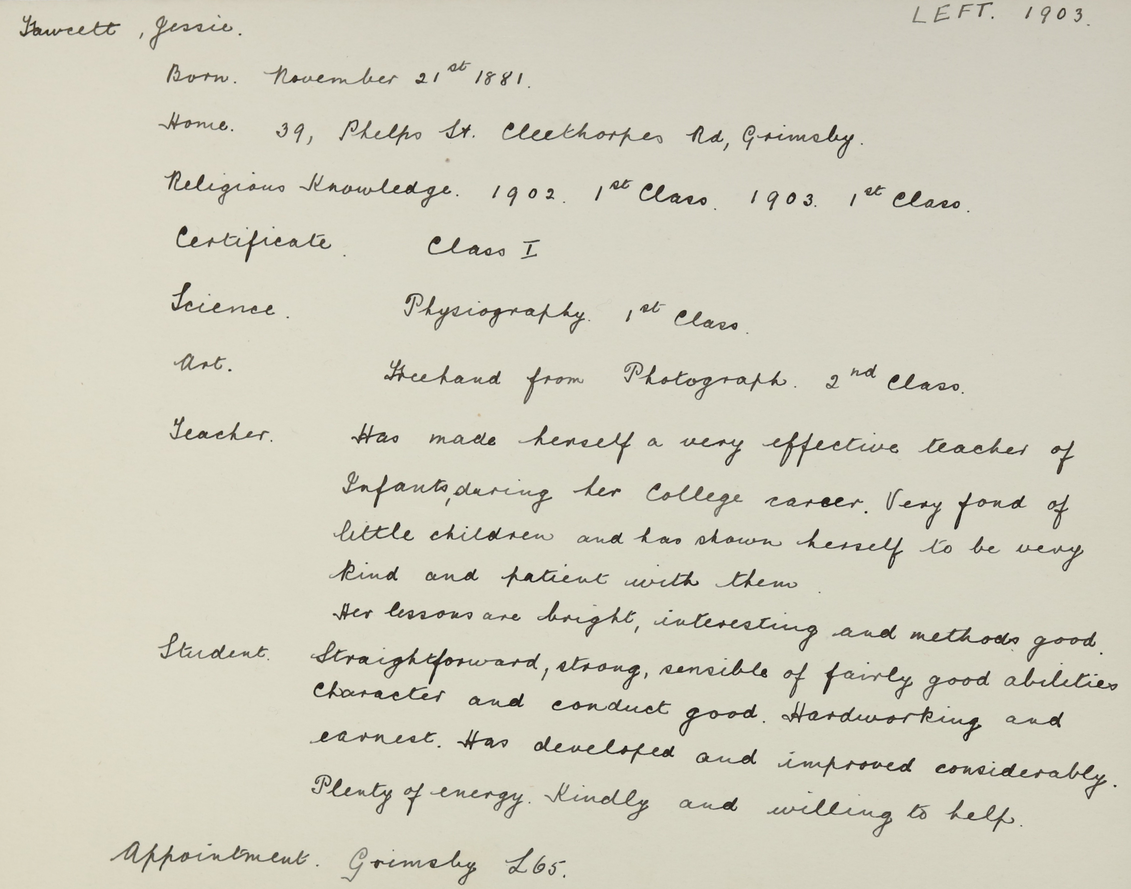 She is at 39 Phelps Street, Cleethorpes. Her father is listed as ‘Locomotive Engine Driver’. Her mother is unlisted. Jessie and her brother, James, are listed as ‘School Teacher’.