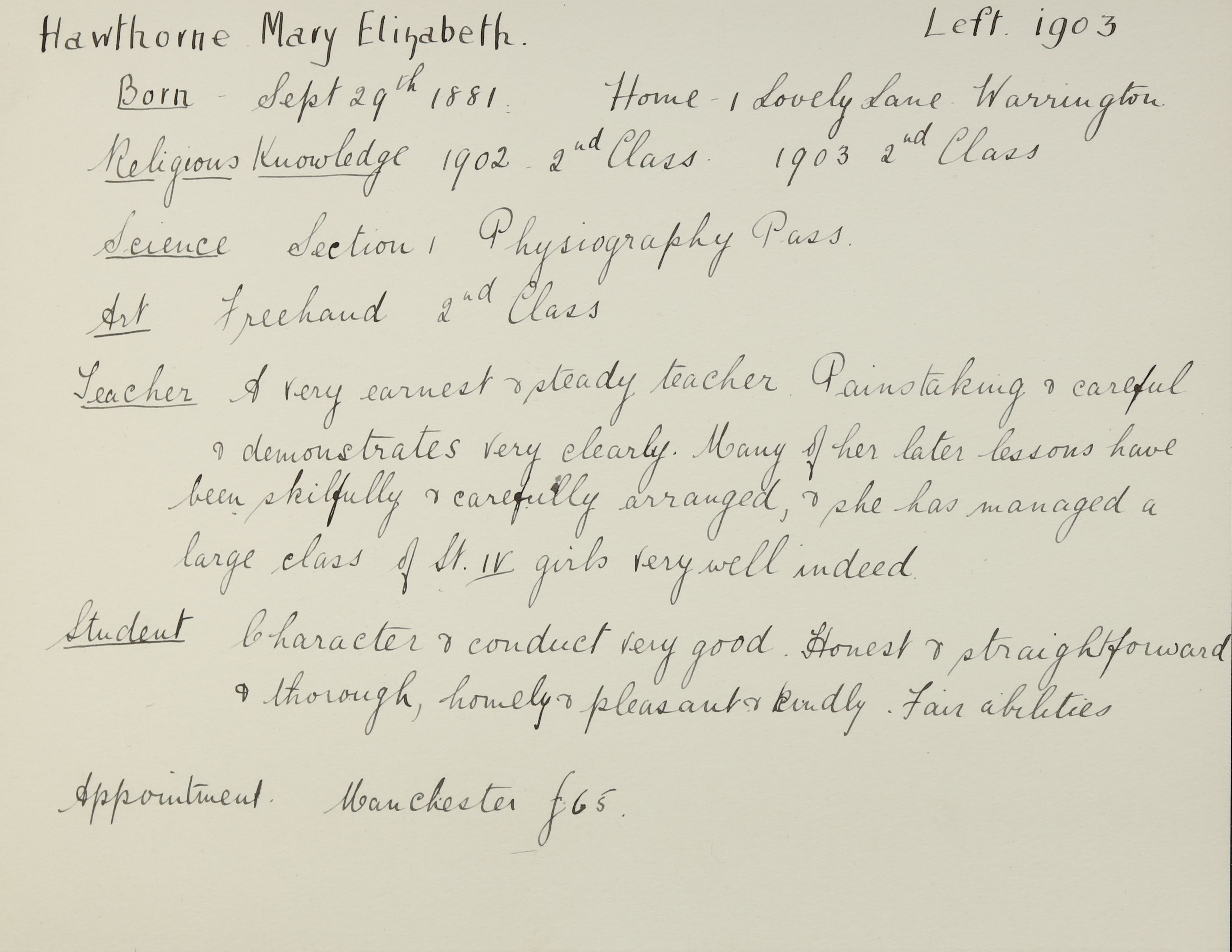 She is at 27 Lovely Lane, Warrington, Lancashire. Her mother is an unlisted widow. Her brother, Joseph, is listed as ‘Private Secretary’. Her sister, Ellen, is unlisted. Mary is listed as ‘Trained Certificated Elem School Teacher’. Her brother, Harold, is listed as ‘Clerk’.