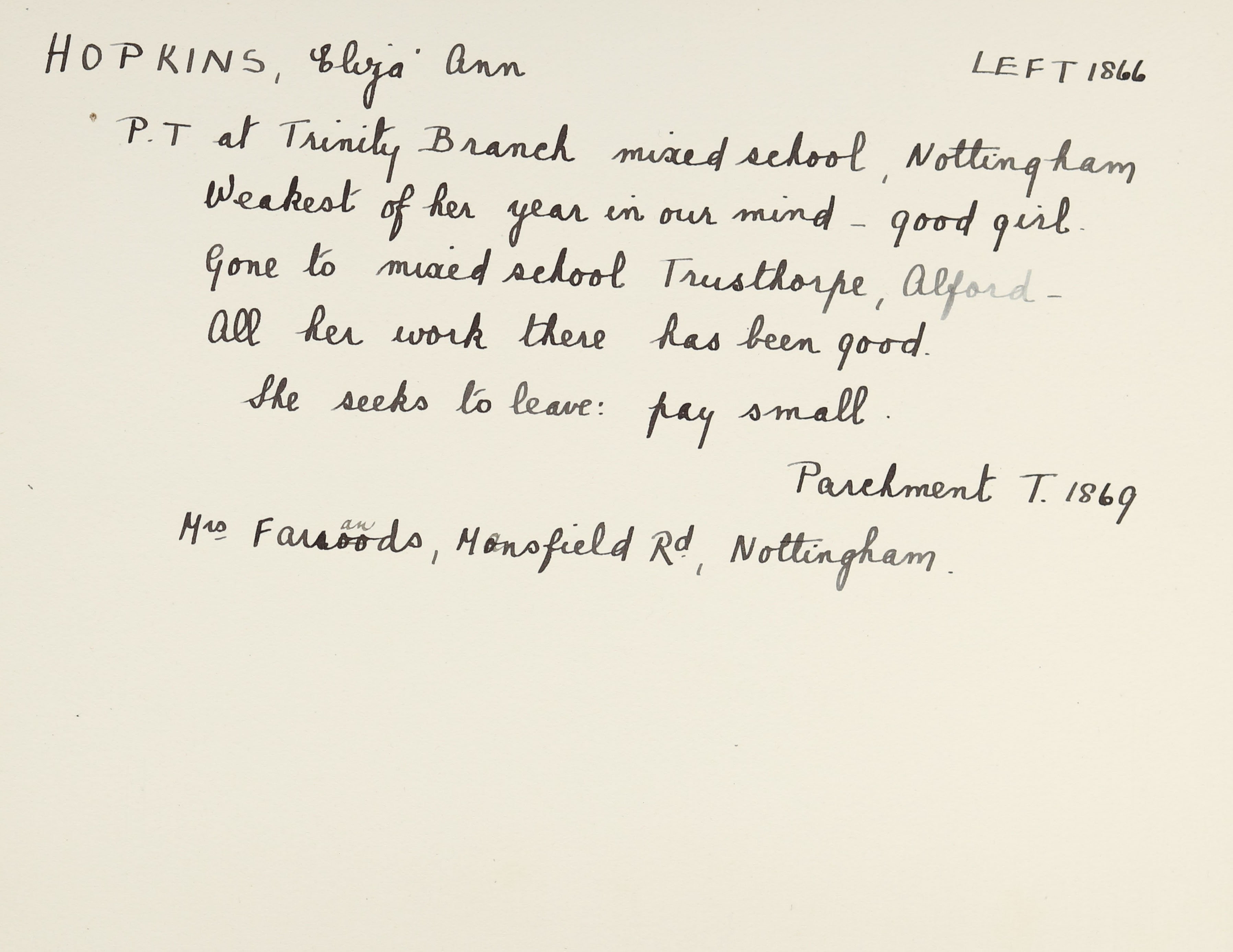 She is at York Street, Nottingham. Her father is listed as ‘Tailor’. Her mother is listed as ‘Lace Mender’. Eliza is listed as ‘Teacher’. There is a lodger, Elizabeth Andrews (b. 1801), listed as ‘Glove Seamer’.