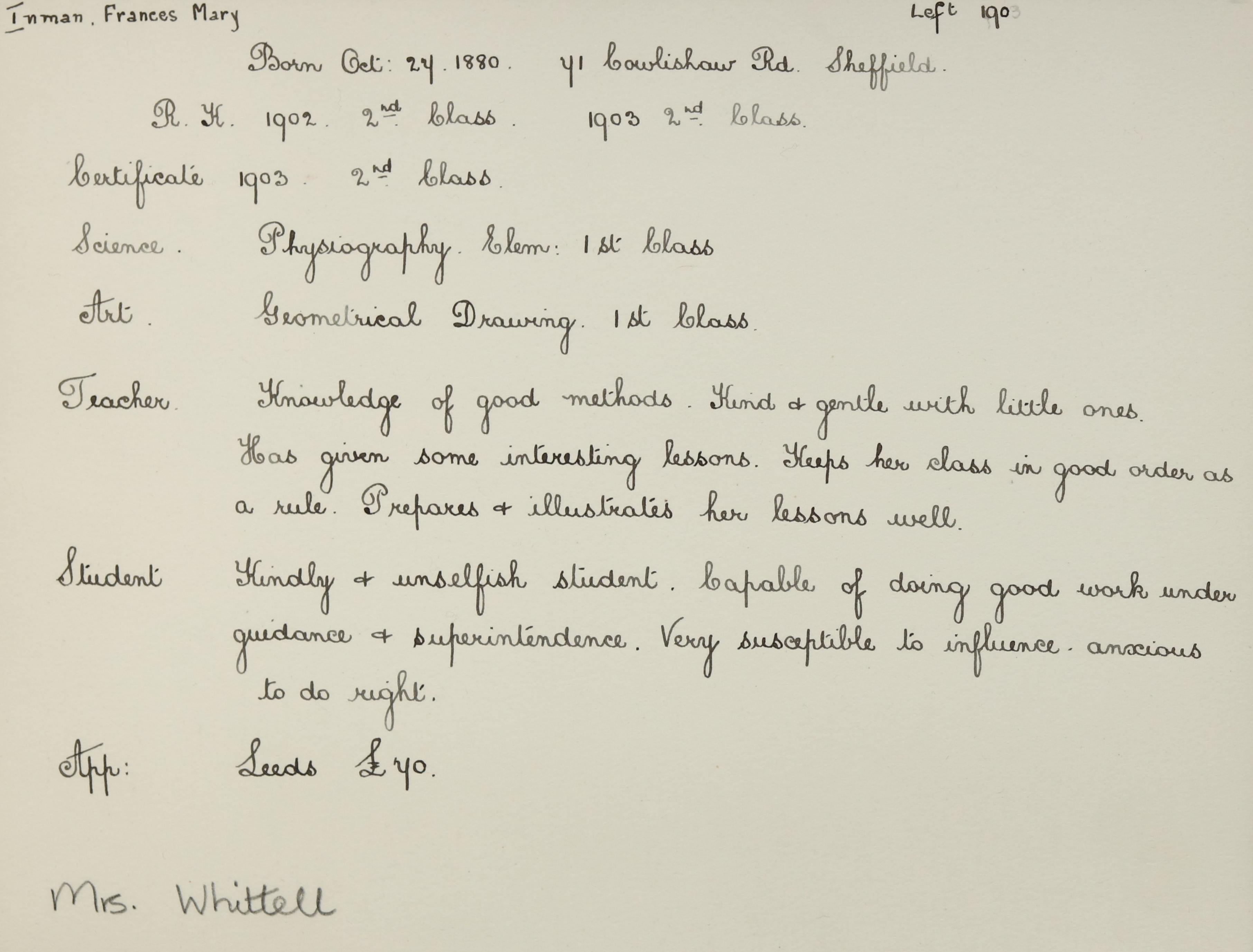 She is at 8 Goodwin Road, Heeley, Sheffield. Her father is listed as ‘Steel Melter’. Her mother, Frances and siblings (Arthur, Elizabeth and Joseph) are unlisted. Her uncle, William T Inman (b. 1848), is listed as ‘Manager Steel Works’.