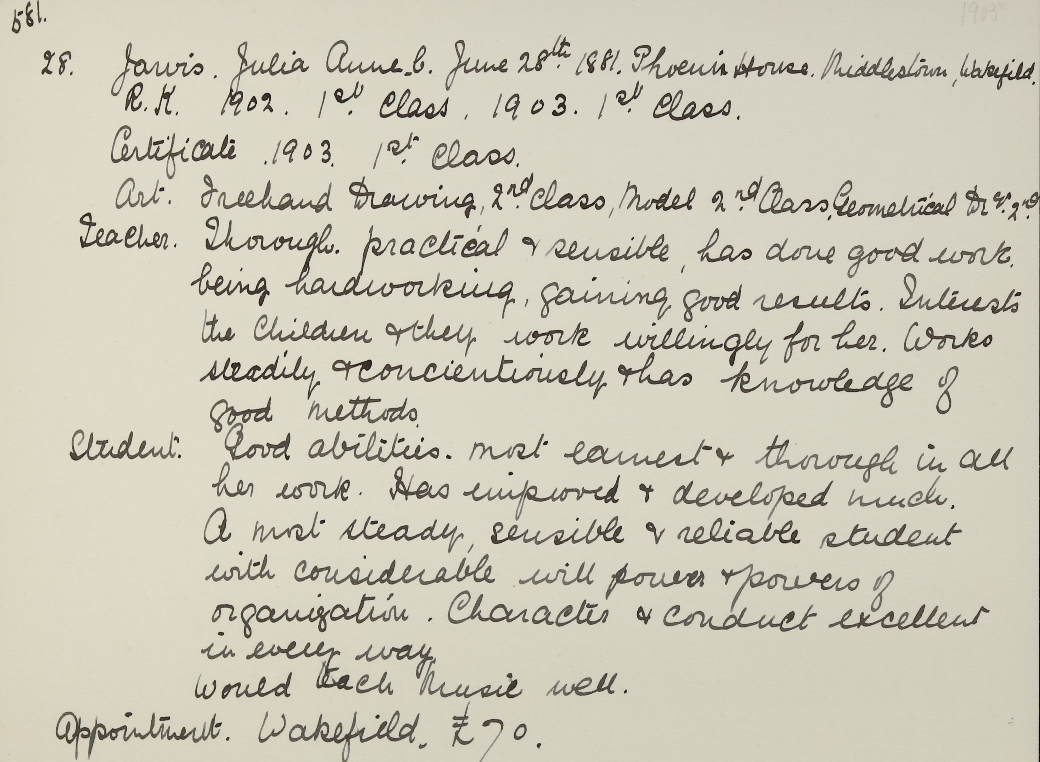 She is at Wesley House, Thornhill Road, Middlestown, Shitlington. Her father is listed as widower and ‘Iron Founder’. Her sisters, Lizzie and Dora, are unlisted. Julia is listed as ‘Pupil Teacher’.