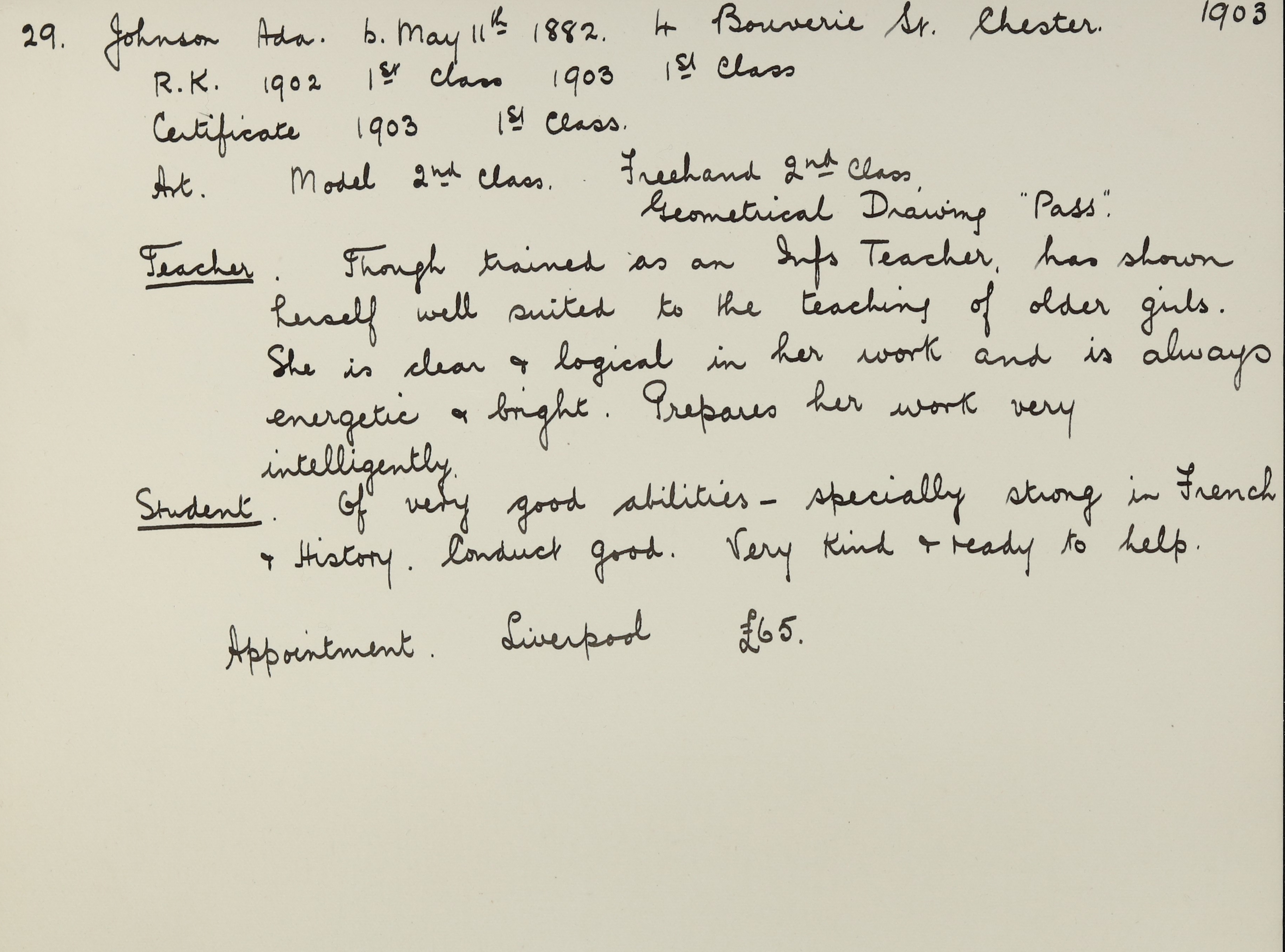 She is at Bouverie Street, Chester. Her father is listed as ‘Accountant’. Her mother, Ada and her brother, Harry, are unlisted. There are two boarders, John Avery (b. 1852, a Commercial Clerk) and Hugh Wildig (b. 1864, a Plumber). Her father’s aunt, Sarah Spencer (b. 1816), is listed as a widow and ‘Living on Her Own Means’.