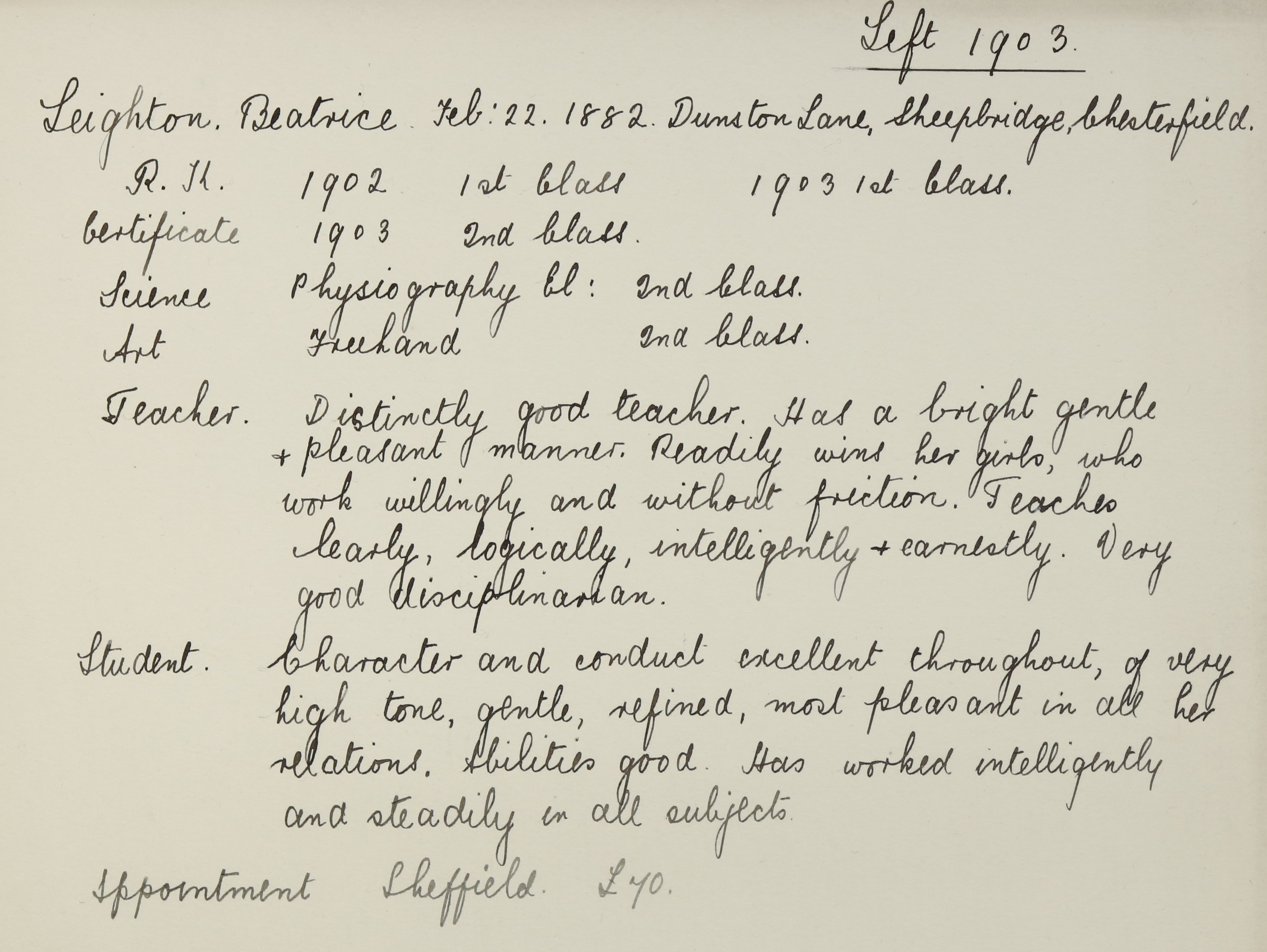 She is at 13 Princess Street, Chesterfield. Her father is listed as ‘Clerk in Telephone Room’. Her mother and sister, Edith, are unlisted. Beatrice is listed as ‘Head Mistress Elementary School’.