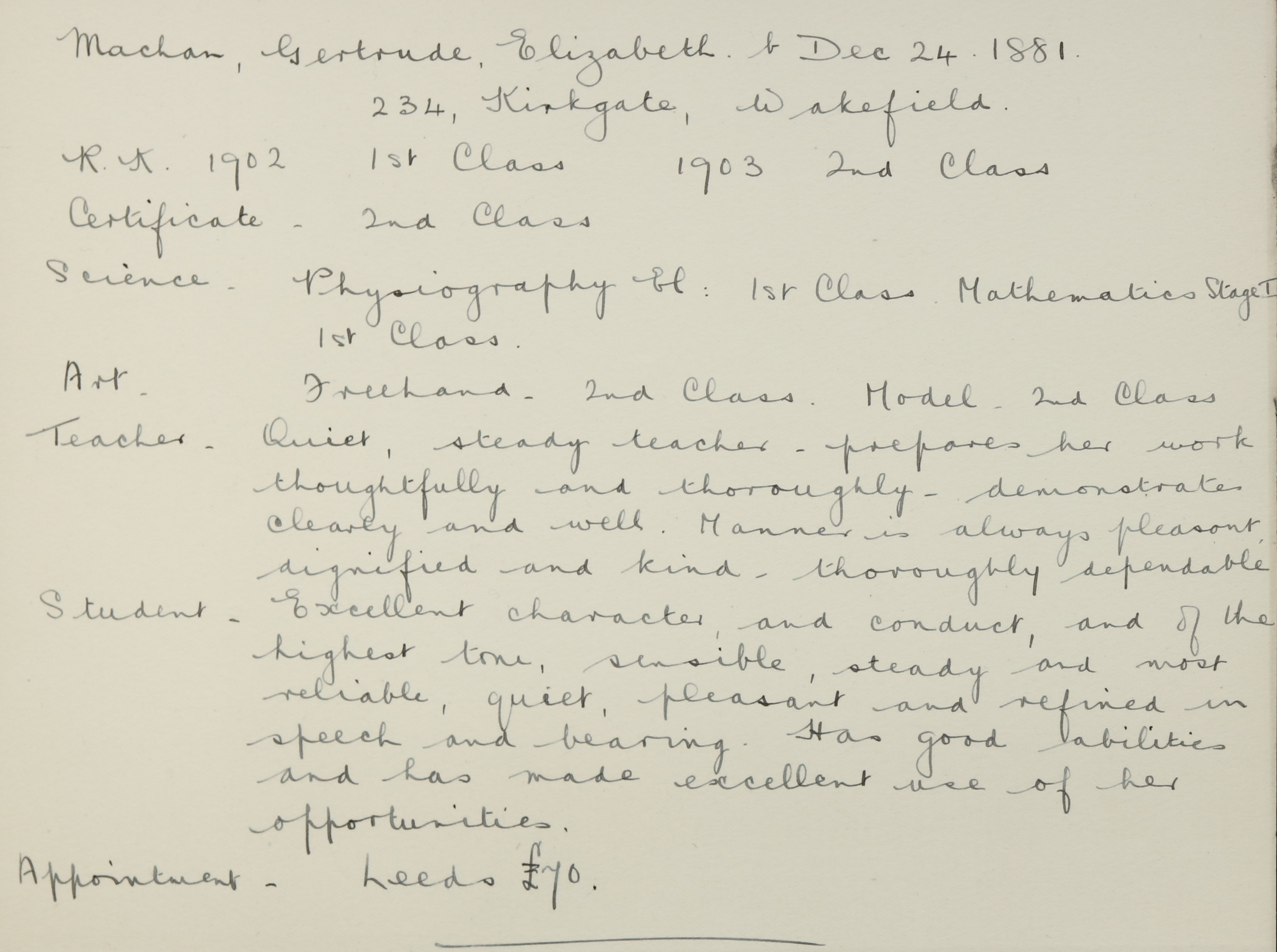 She is at 30 Benjamin Street, Wakefield. Her father is listed as ‘Fancy Goods Merchant’. Her mother and brother, Charles, are unlisted. Gertrude is listed as ‘School Teacher Elementary’. Her sister, Agnes, is listed as ‘Shop Assistant Dry Cleaners’. Her grandfather, William Blakey (b. 1824) is listed as widower and ‘Living on Own Means’.