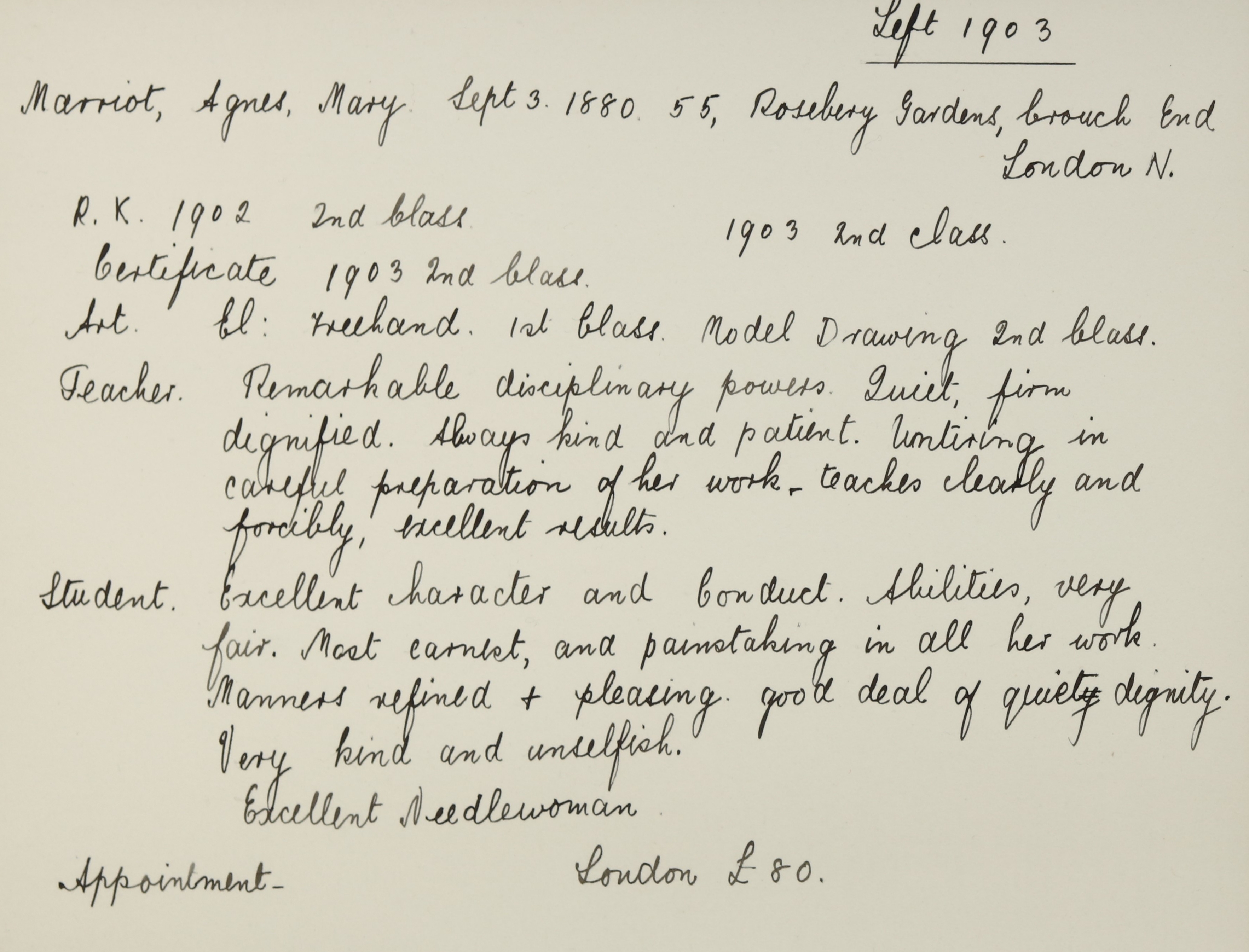 She is at 44 Queen’s Road, Stoke Newington. Agnes is listed as ‘Elementary School Teacher LCC’. There is an unlisted boarder, Florence Caris (b. 1863).