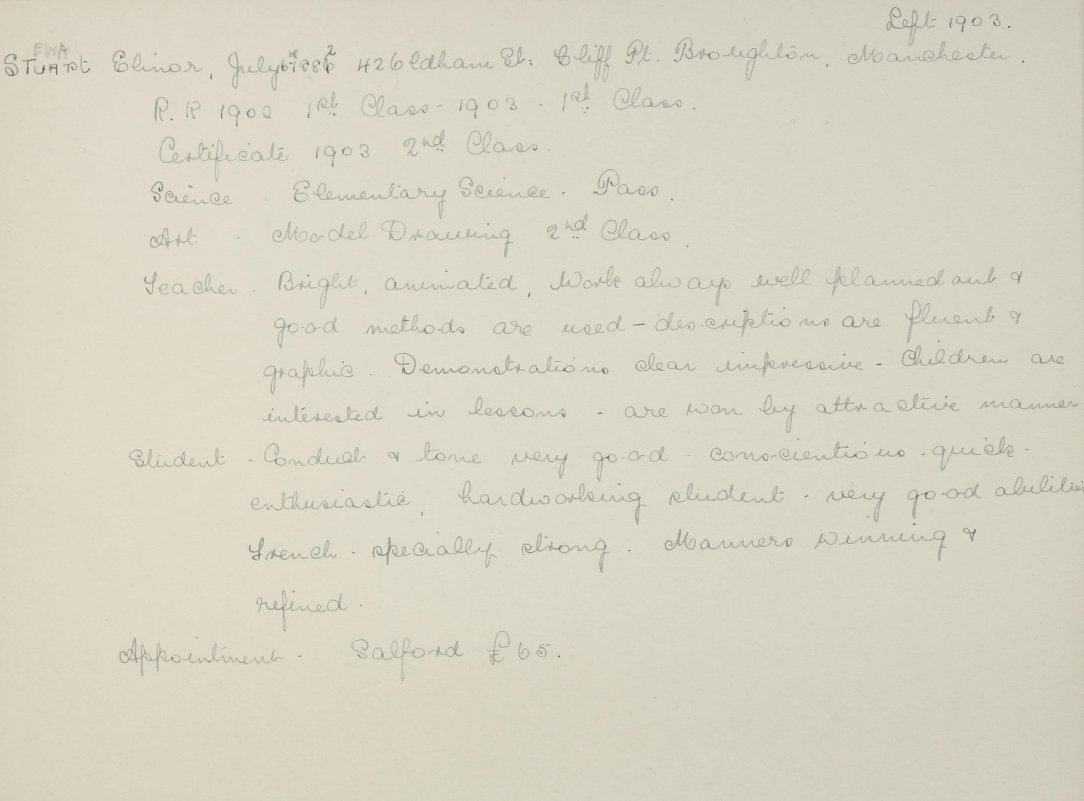 She is at Albany Street, Pendleton, Salford. Her father is listed as ‘Iron Postman’. Elinor, her mother and brothers (Charles & John) are unlisted.