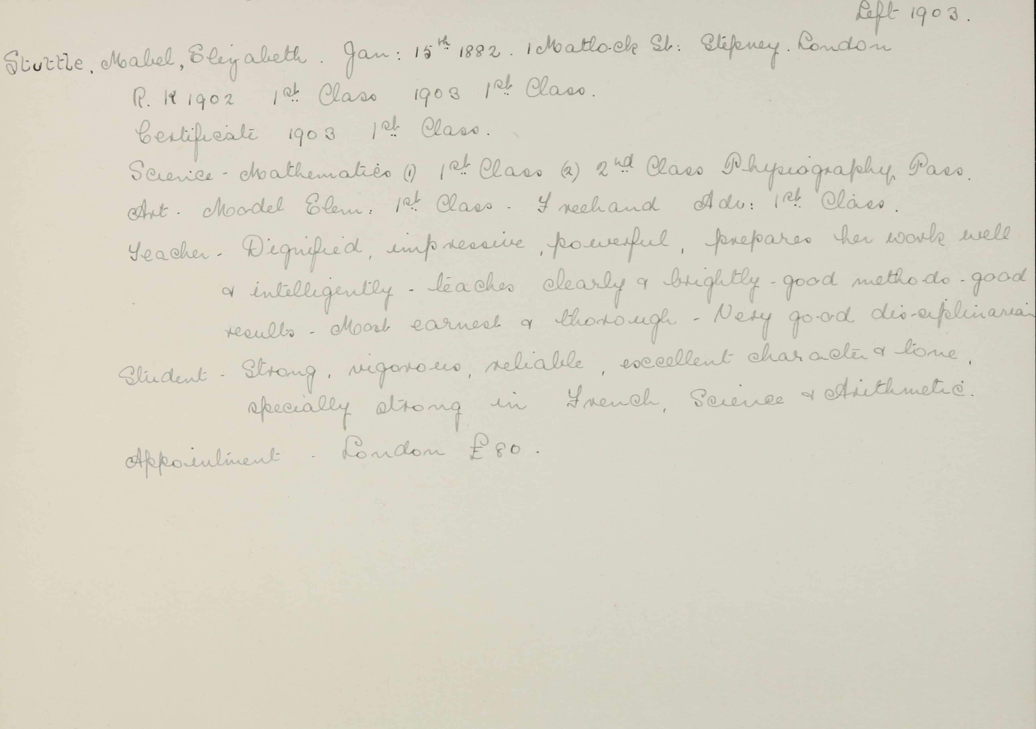 She is at 1 Matlock Street, Limehouse, Stepney. Her father is listed as ‘Builder’. Her mother and brother, Herbert, are unlisted. Mabel is listed as ‘Pupil Teacher’. Her brother, Benjamin, is listed as ‘Architects Pupil’.