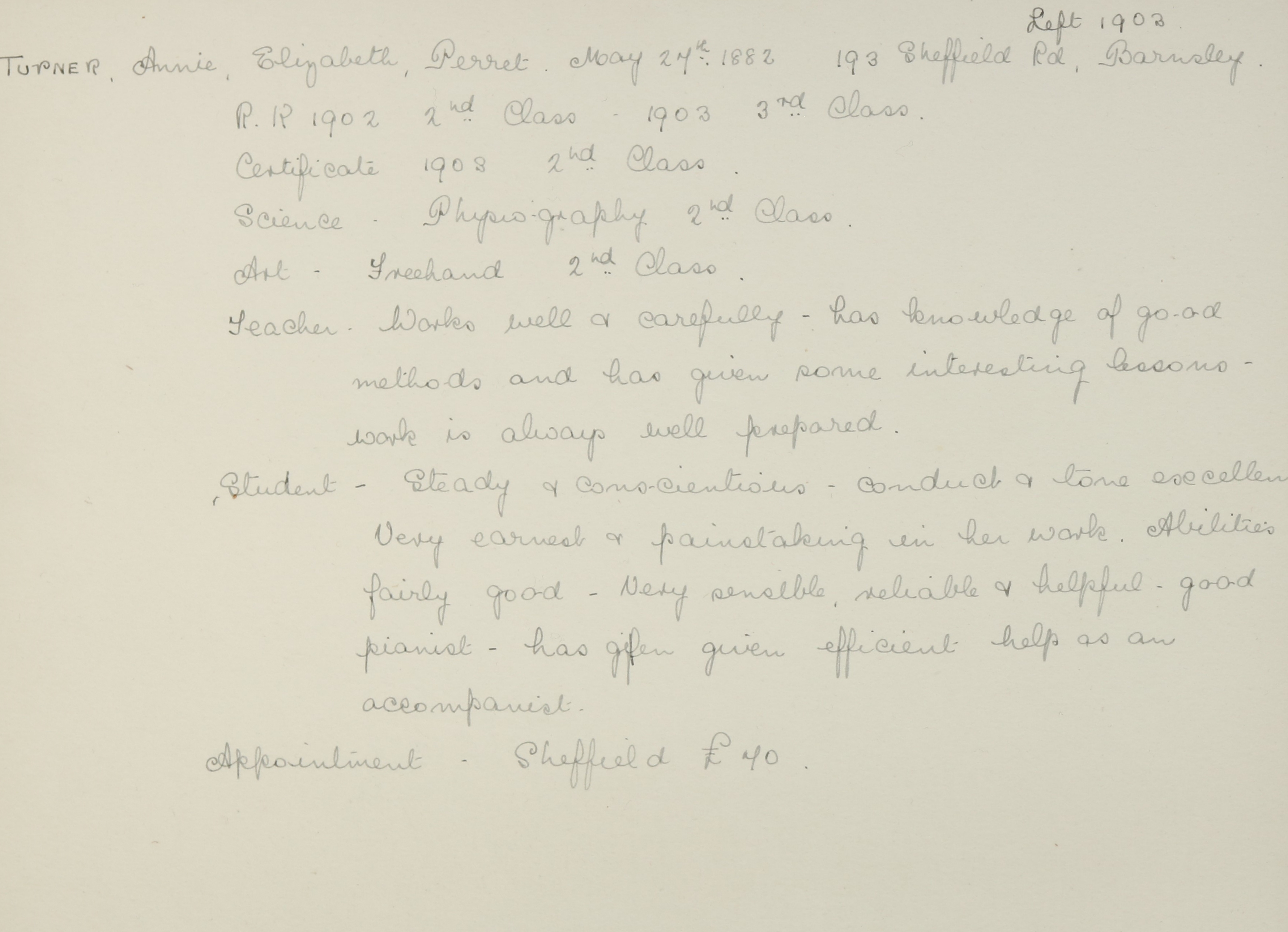 She is at 204 Sheffield Road, Barnsley, Yorkshire. Her father is listed as ‘Carver and Guilder’. Her mother is listed as ‘Certified Teacher’. Annie is listed as ‘Assistant Teacher’. Her sister, Lizzie, is listed as ‘Pupil Teacher’. There is a servant, Florence Belton (b. 1880).