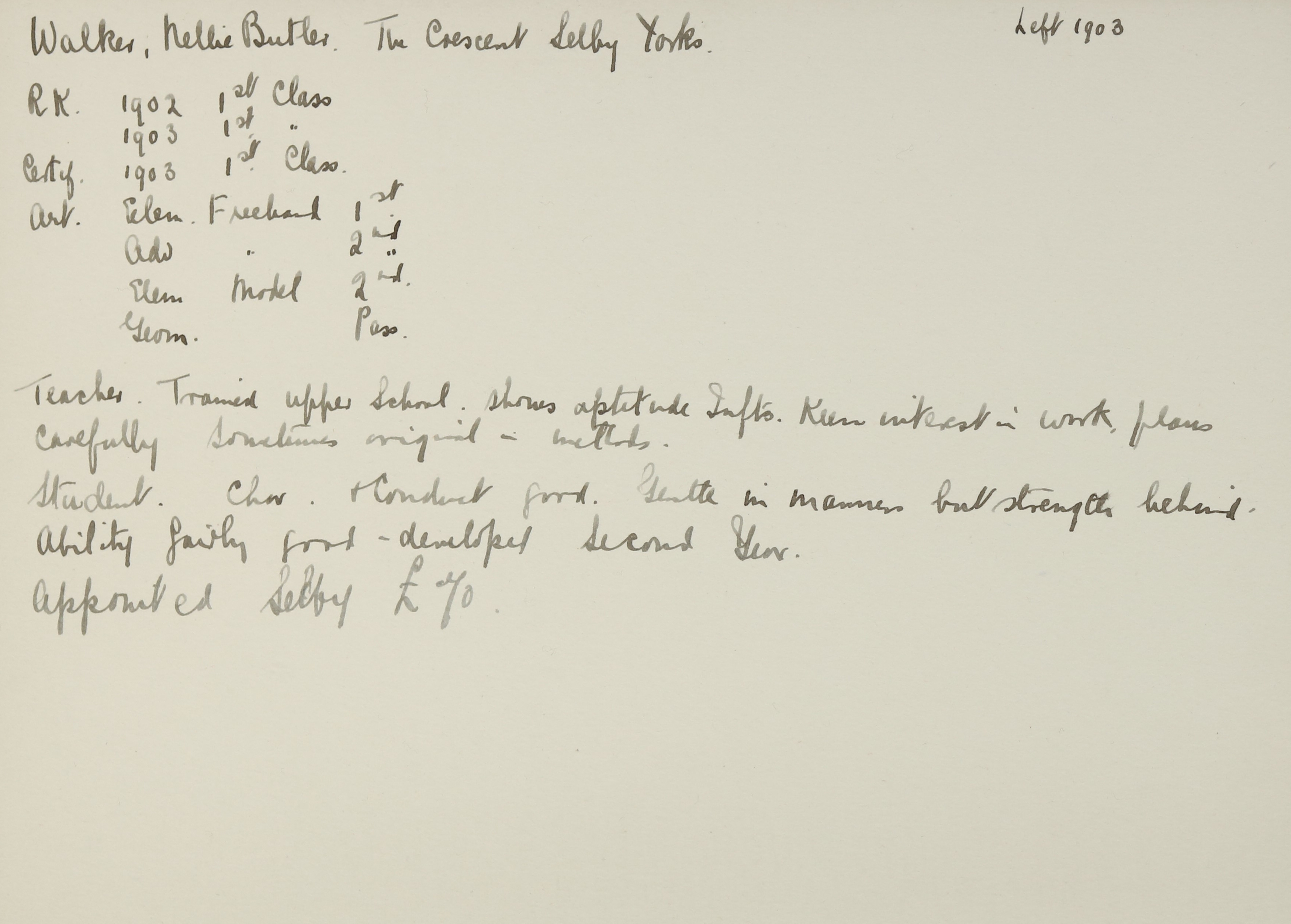 She is at The Crescent, Selby, Yorkshire. Her father is listed as ‘Draper and Boot Dealer’. Her mother and sister, Hilda, are unlisted. Nellie is listed as ‘Elementary School Teacher’. Her grandfather, John Grace (b. 1832), is listed as ‘Coal Merchant’.