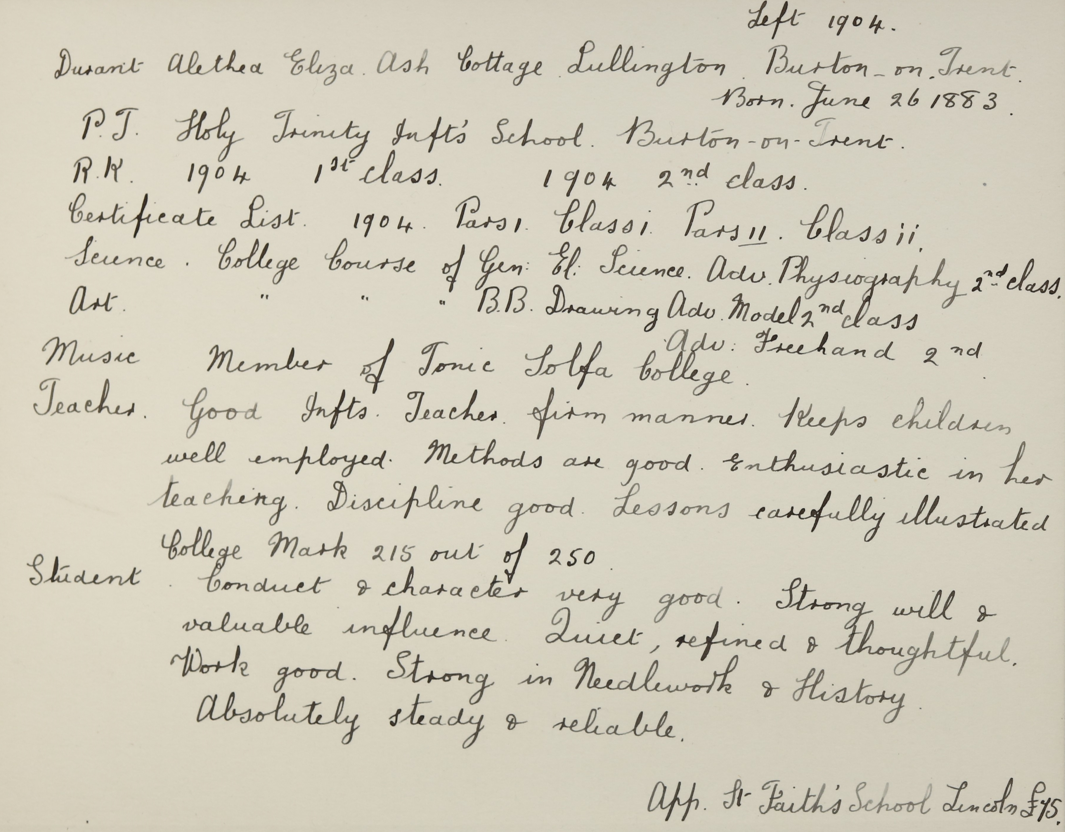 Appointed to St. Faith's Infants', Lincoln. £75.